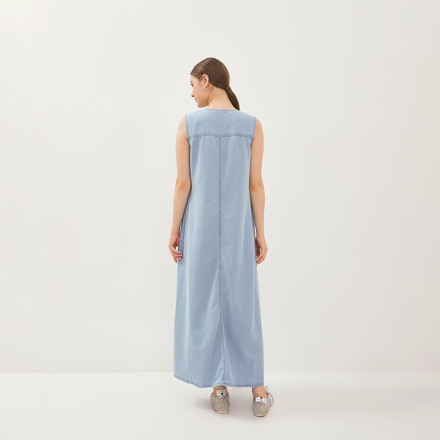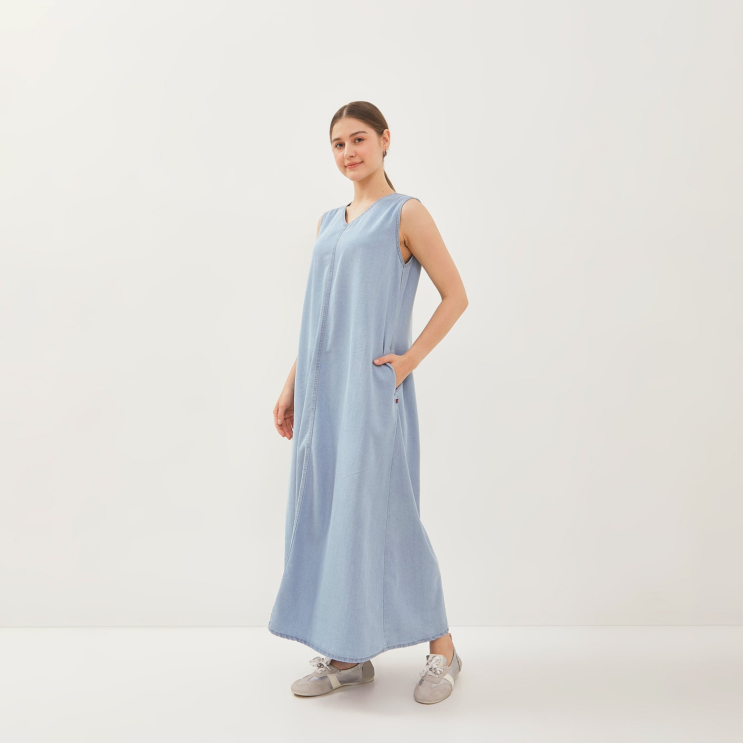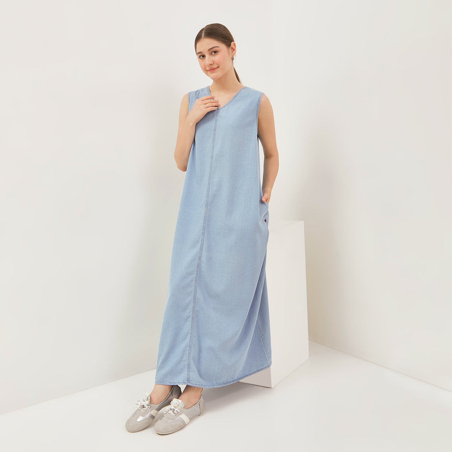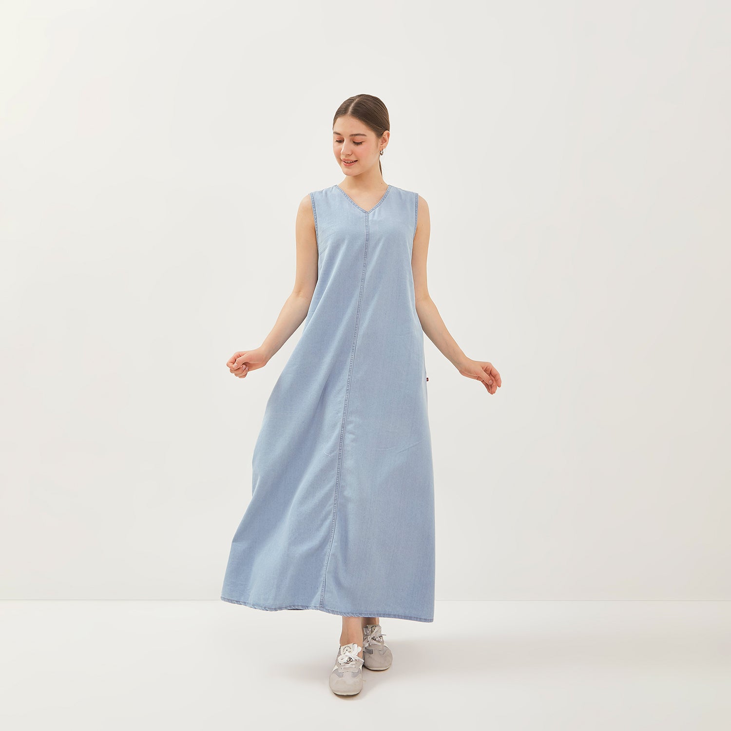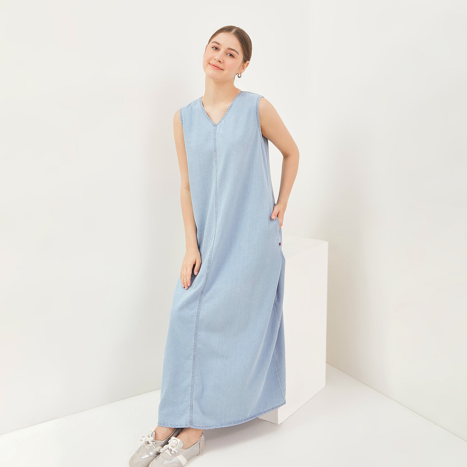 Maksi dress jeans grafis yang tampil modern dan effortless