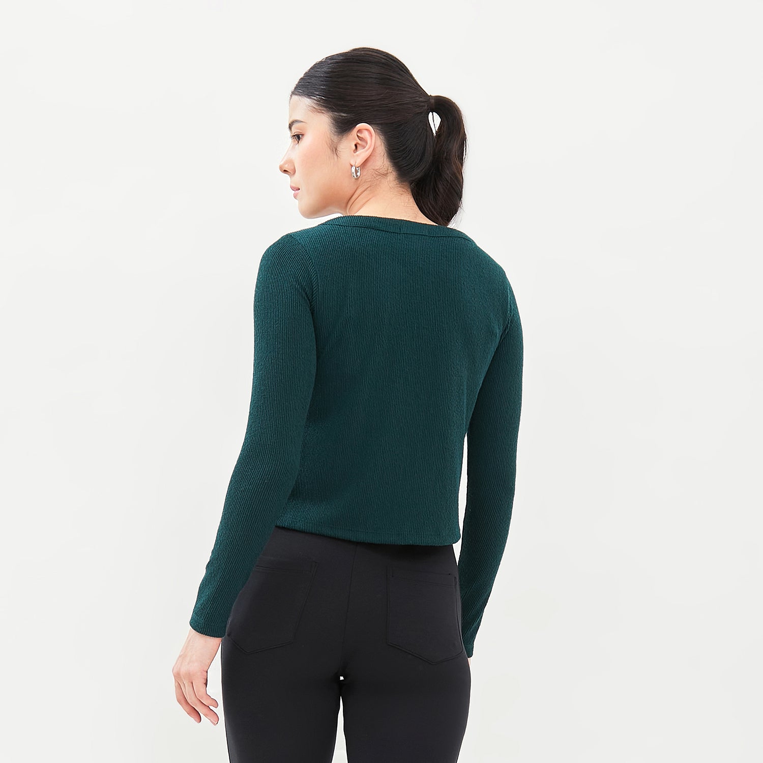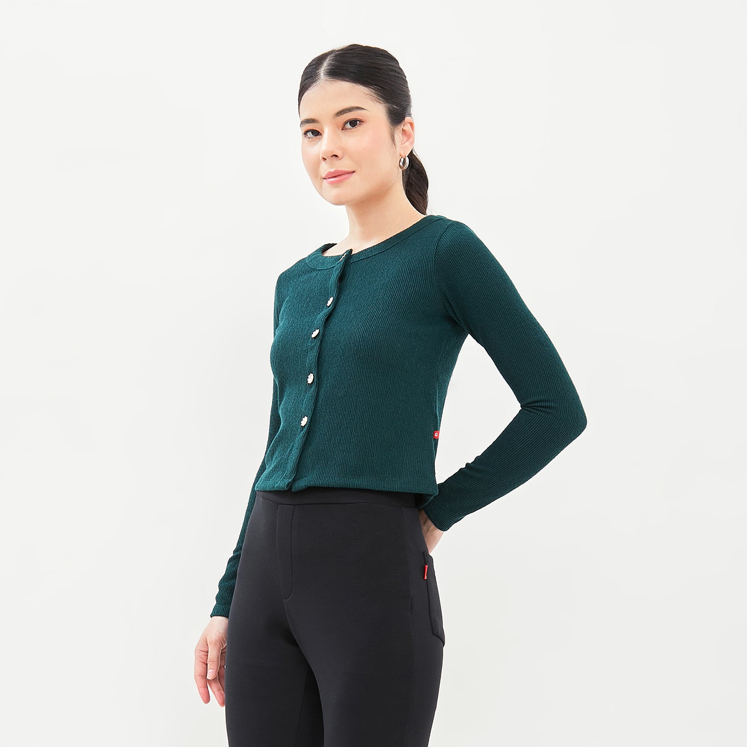 Memiliki lengan panjang yang memberikan kesan rapi, dengan potongan semi crop yang membuat tampilan terlihat lebih modern dan stylish
