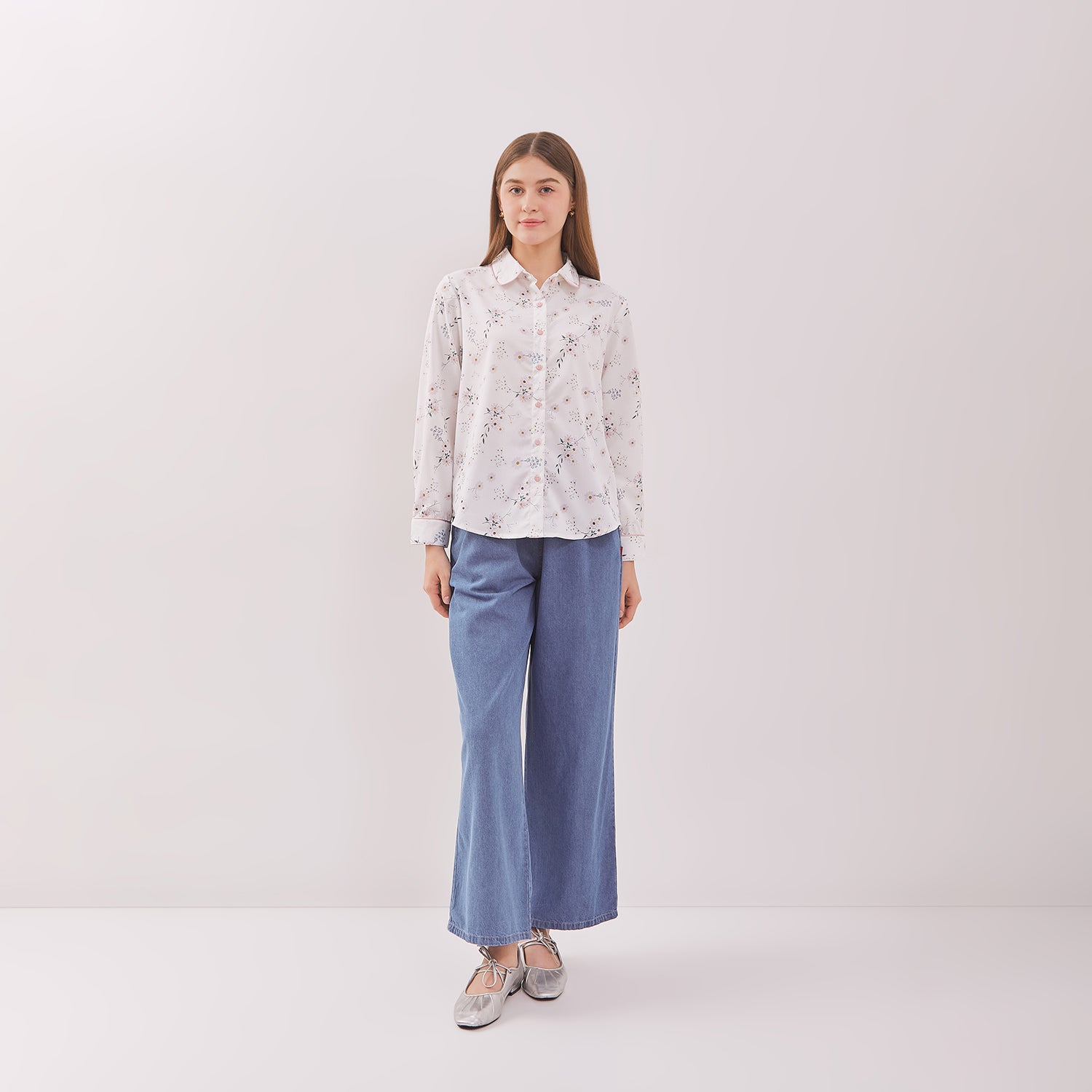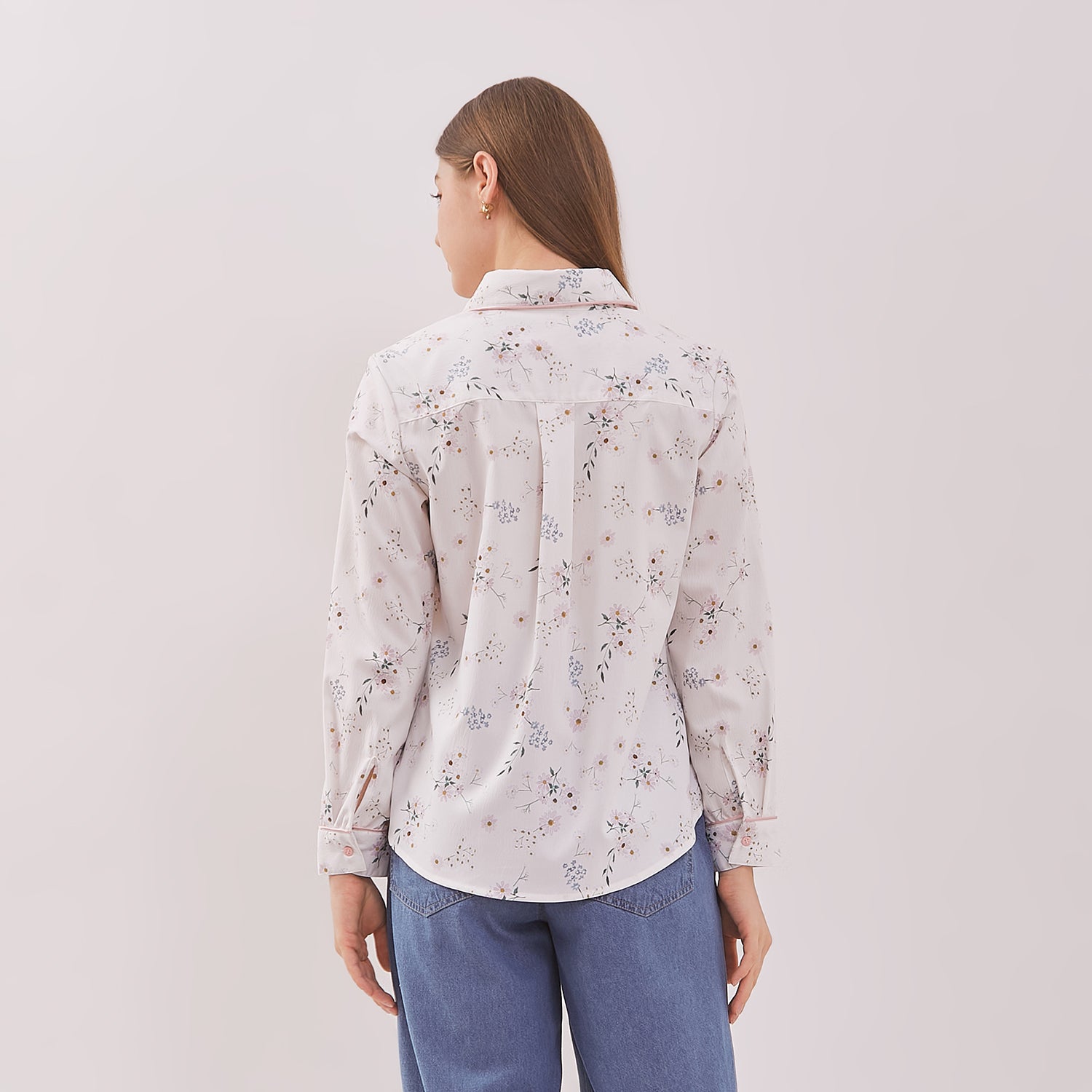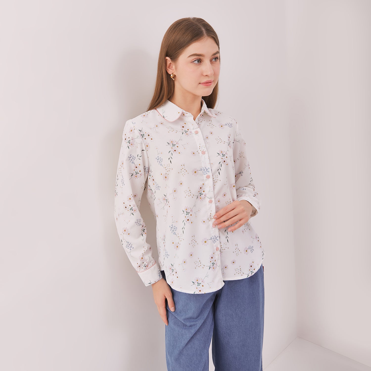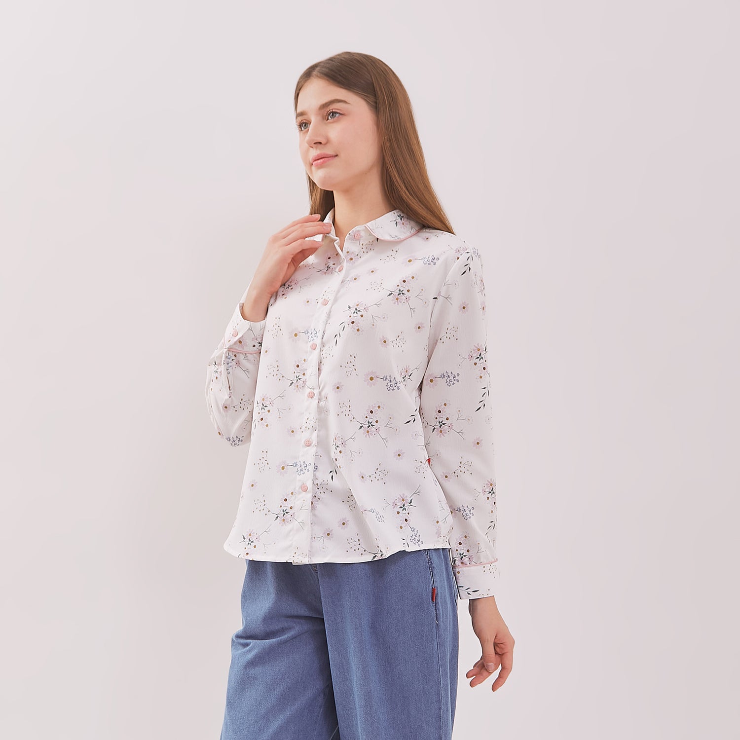 Kemeja ini hadir dengan motif bunga bernuansa soft yang memberikan kesan feminin dan elegan