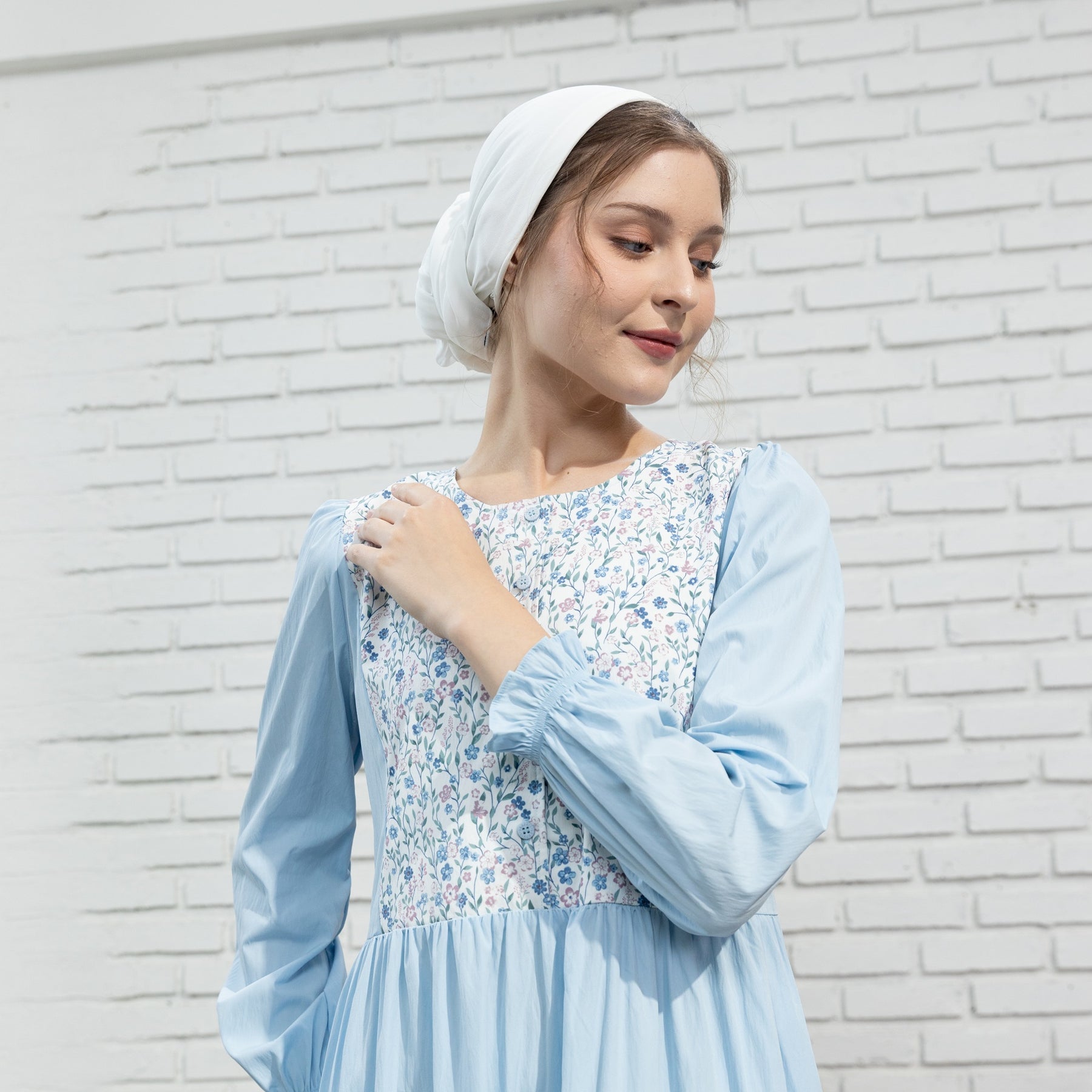 Lengan panjang dengan ujung karet elastis, membentuk efek puff sleeve lembut