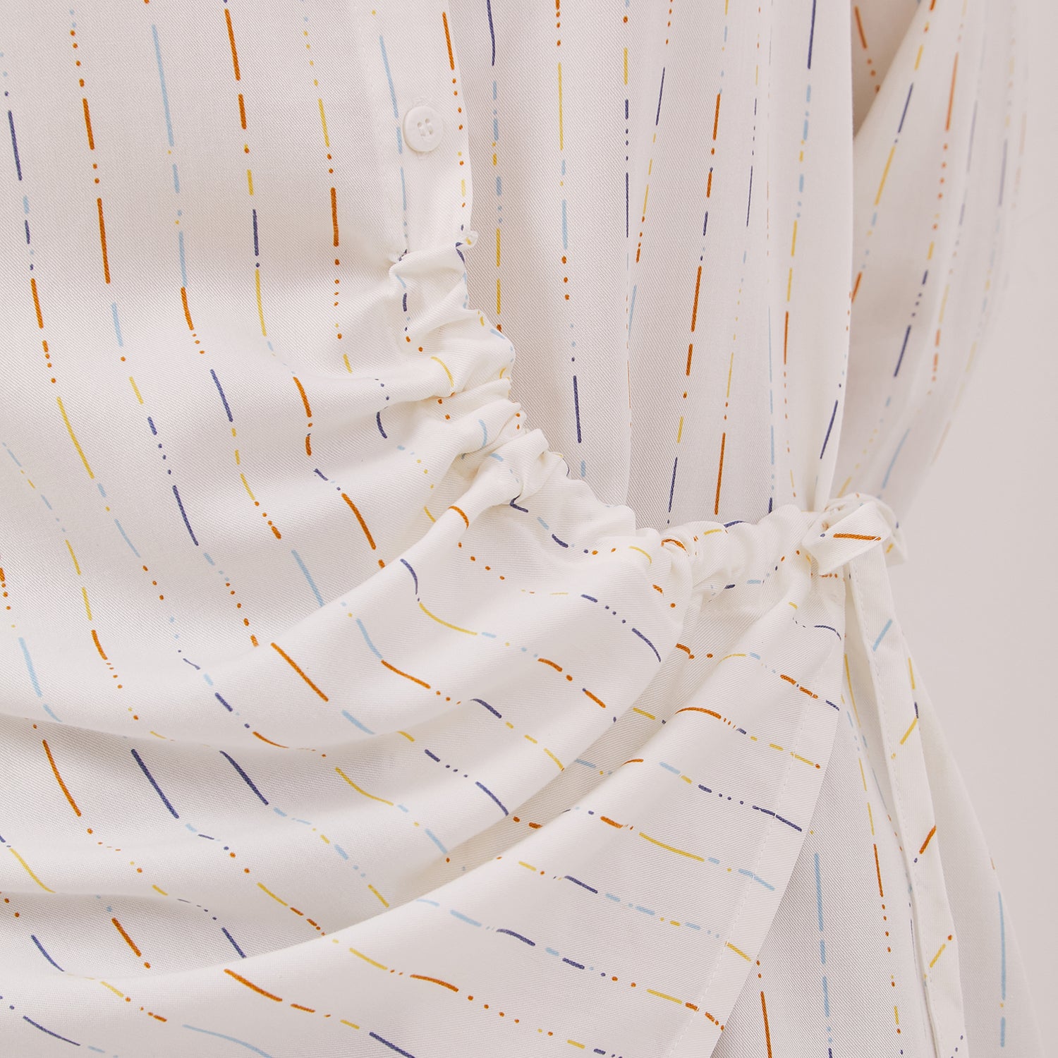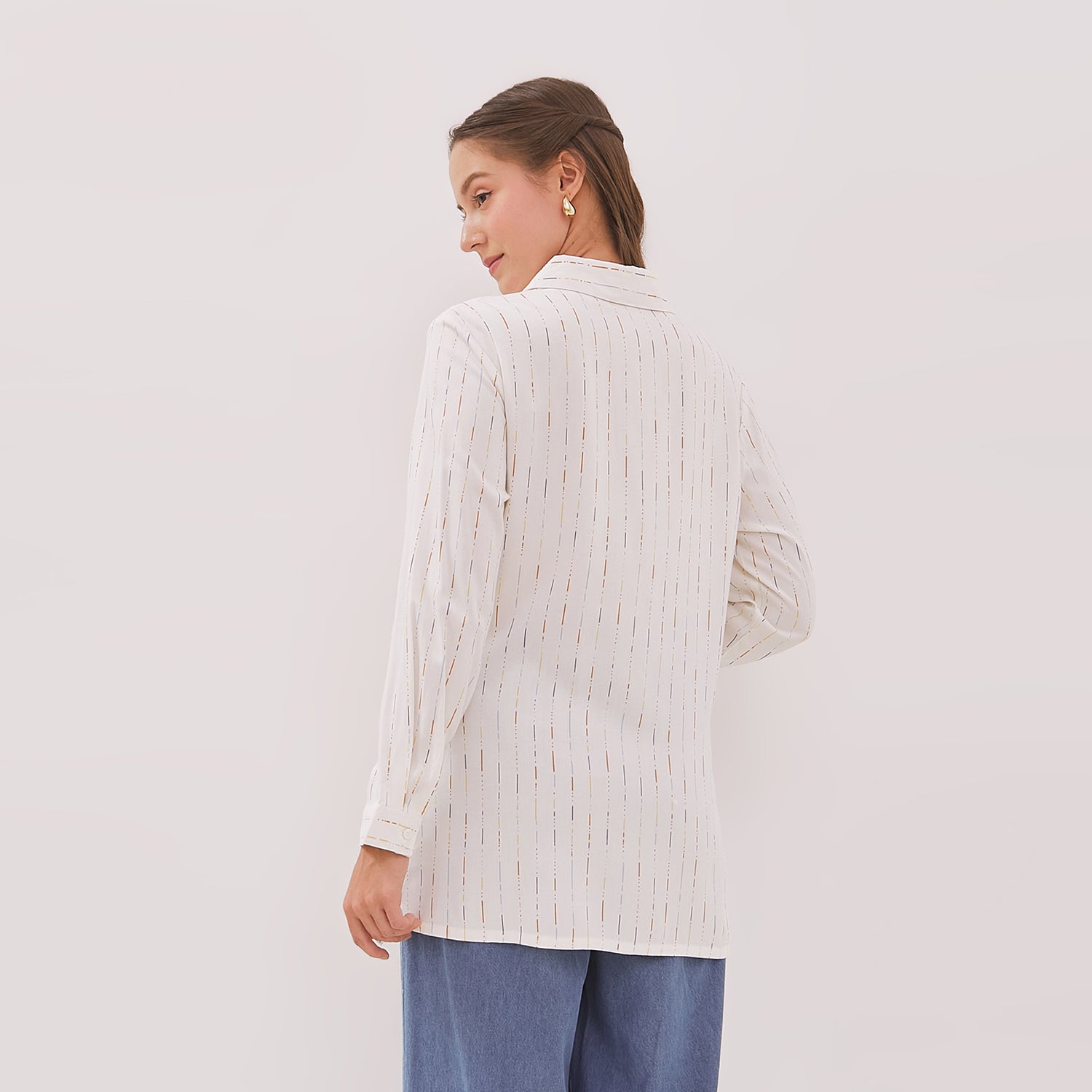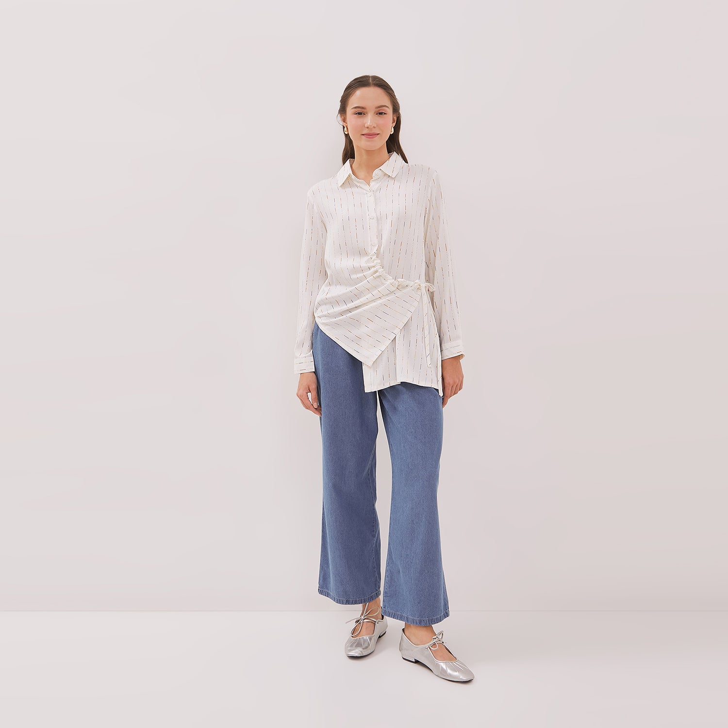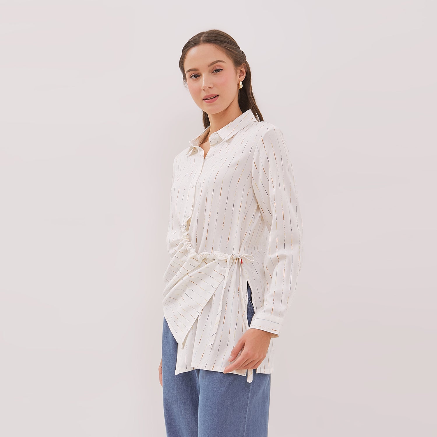 Bagian depan memiliki full bukaan kancing dan sentuhan tali playful di bagian ujung depan yang bisa diikat sesuai gaya casual, chic, atau edgy