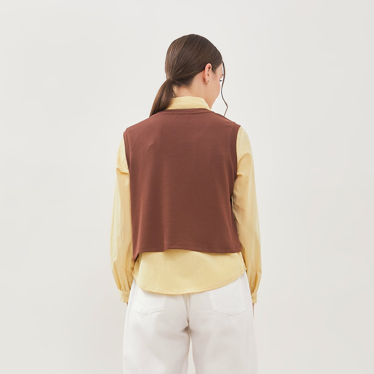 - Vest model V-neck ini bisa dilepas-pasang, jadi kamu bebas mix and match sesuai mood