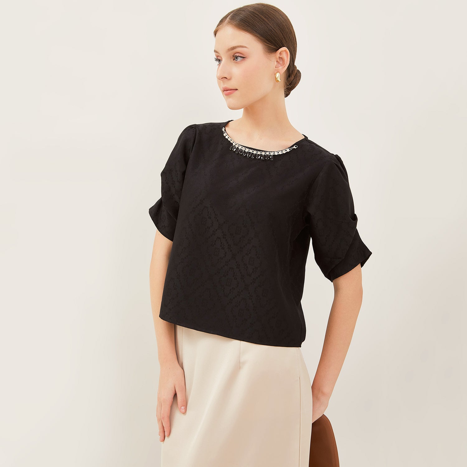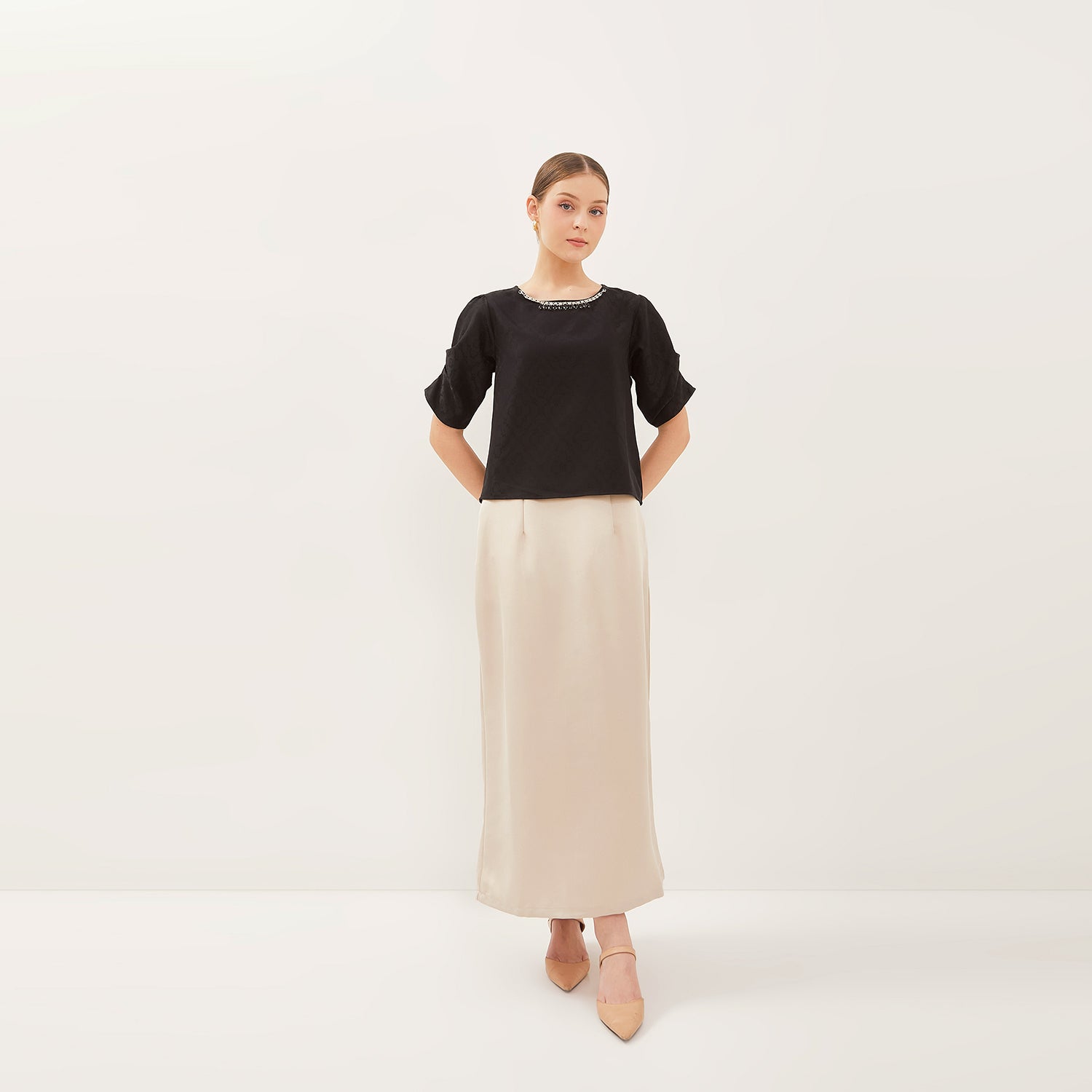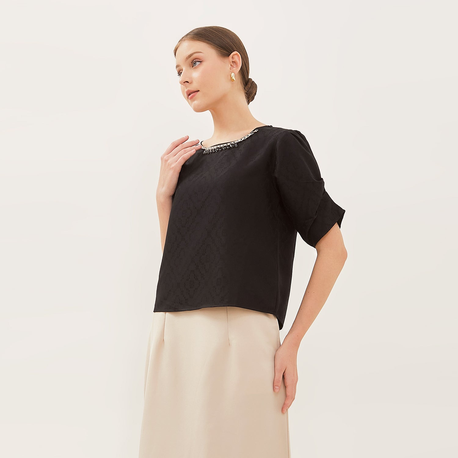 Atasan simplicity dengan model leher bulat yang clean dan effortless