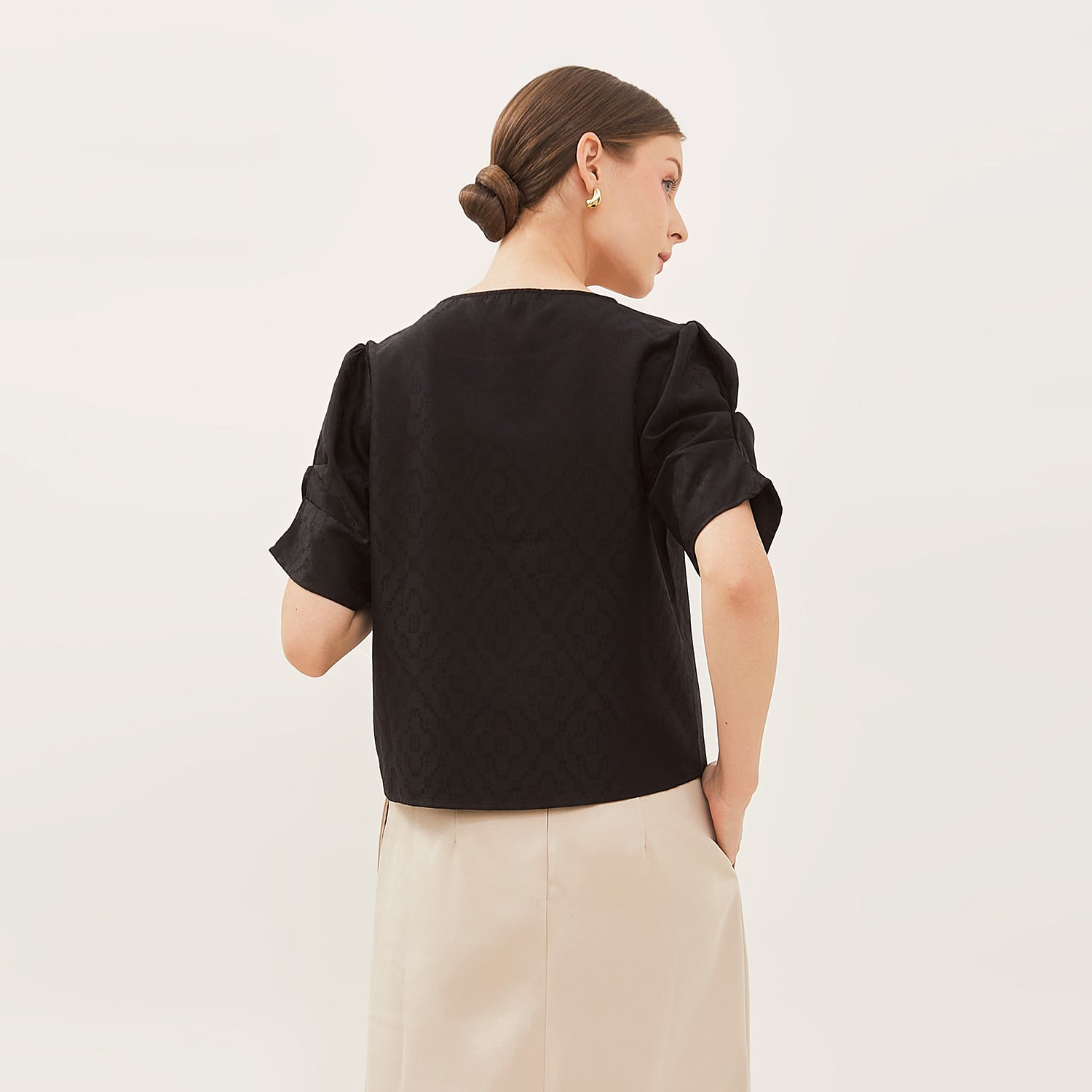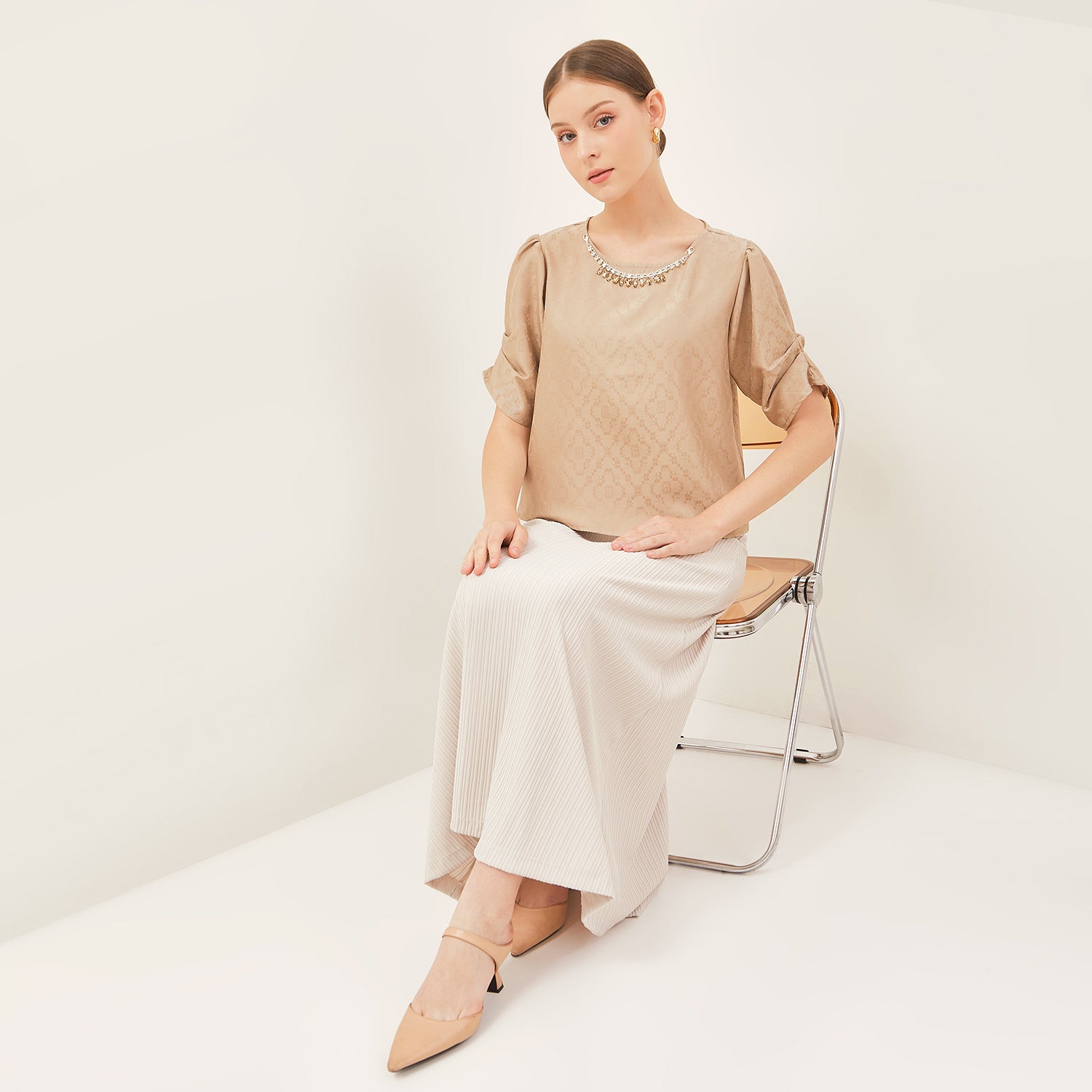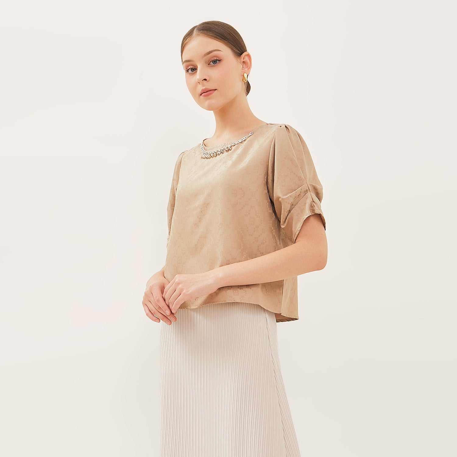 Lengan pendek dengan aksen lipatan menambah sentuhan modern dan rapi pada desain