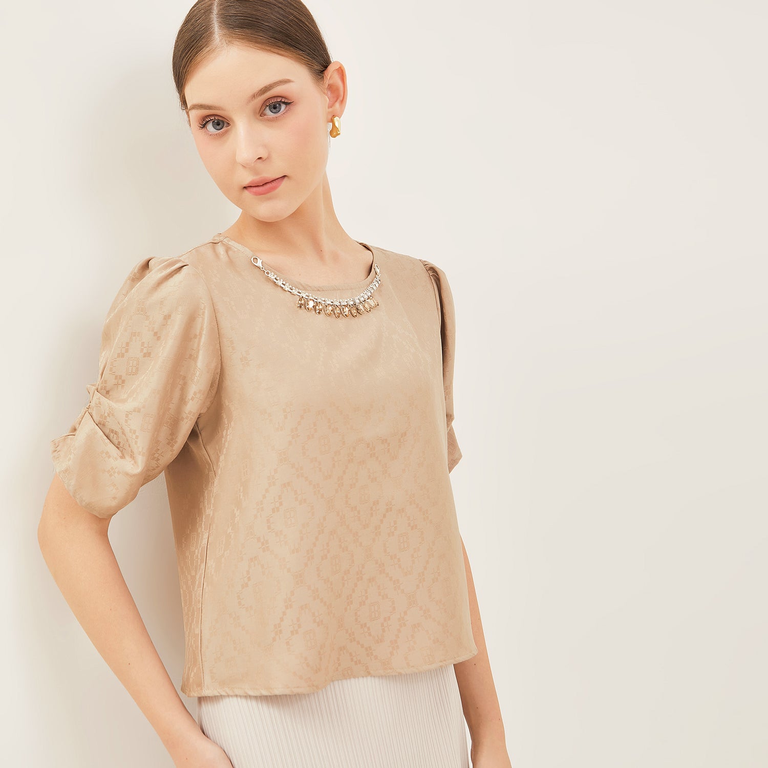 Menggunakan bahan jacquard bertekstur yang memberikan kesan elegan tanpa berlebihan