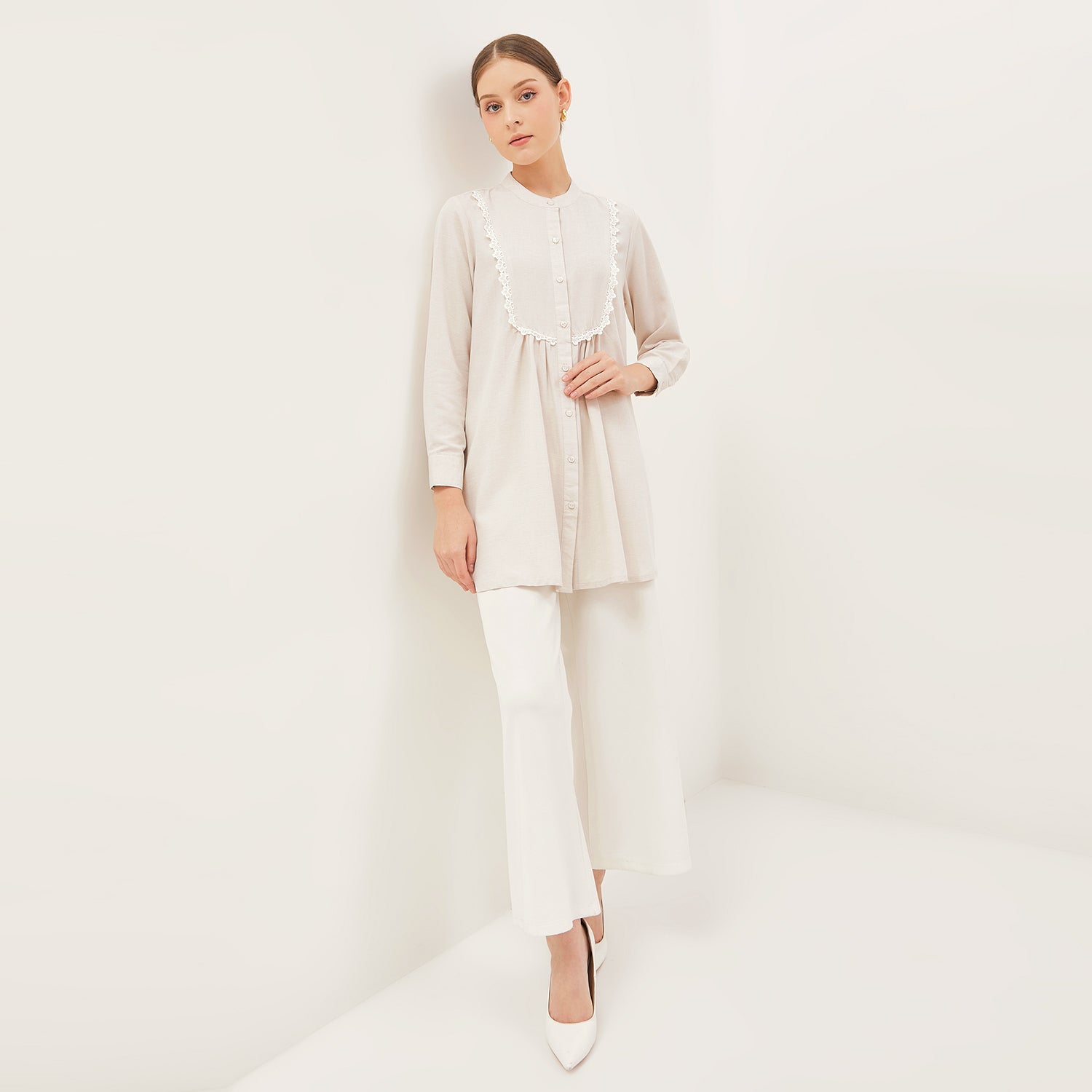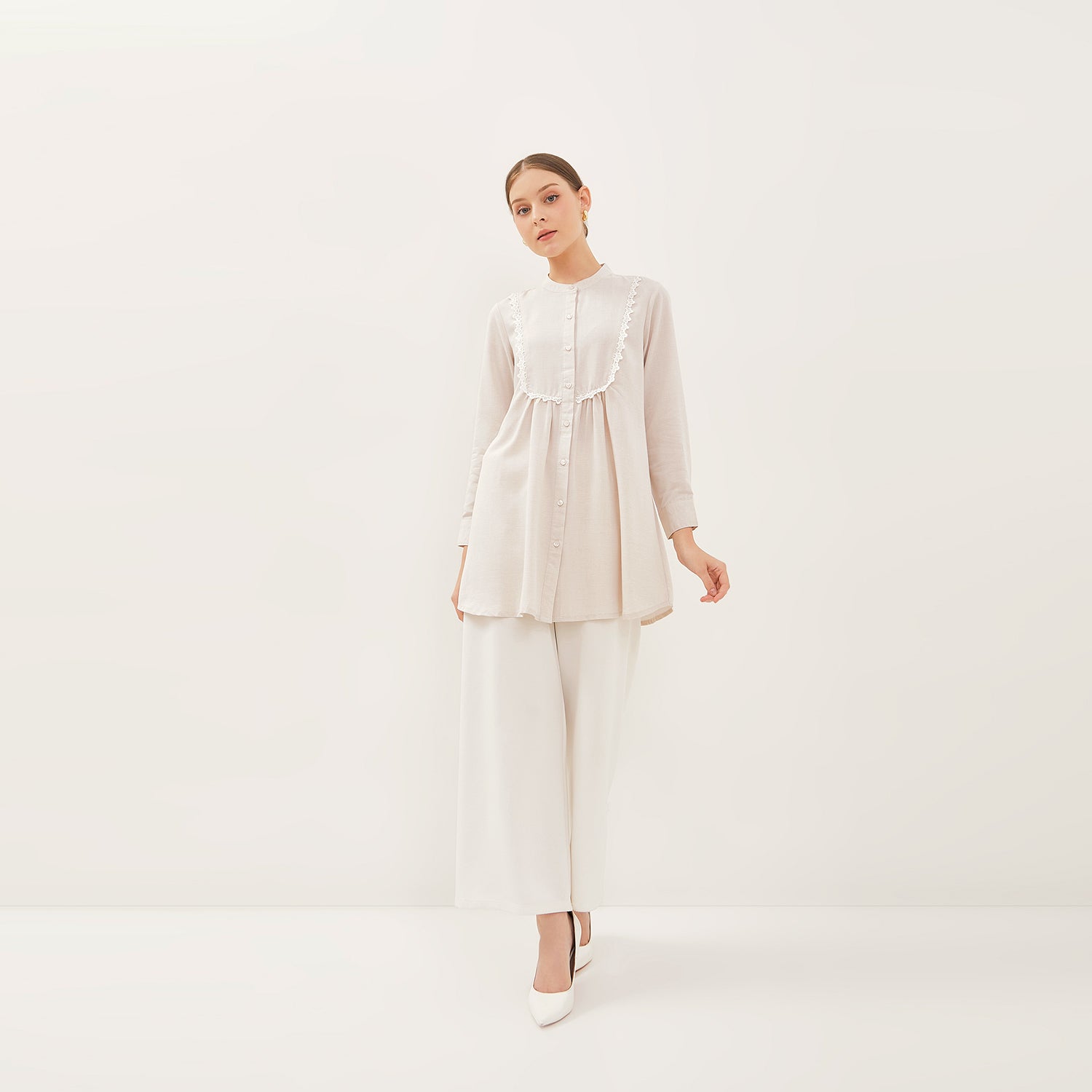 Potongan bawahnya sedikit flare, memberikan siluet jatuh yang manis dan mudah dipadukan dengan berbagai bawahan