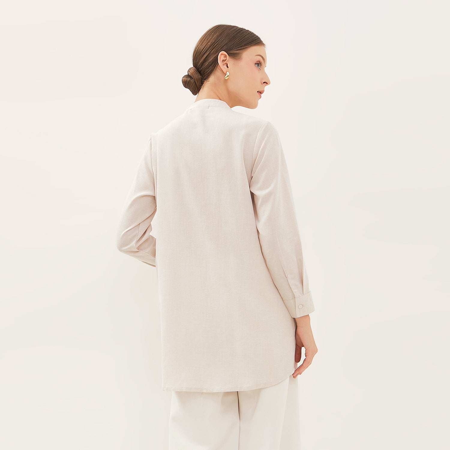 Memiliki lengan panjang dengan detail cuff dan bukaan kancing di ujungnya, memberikan tampilan yang lebih formal namun tetap santai