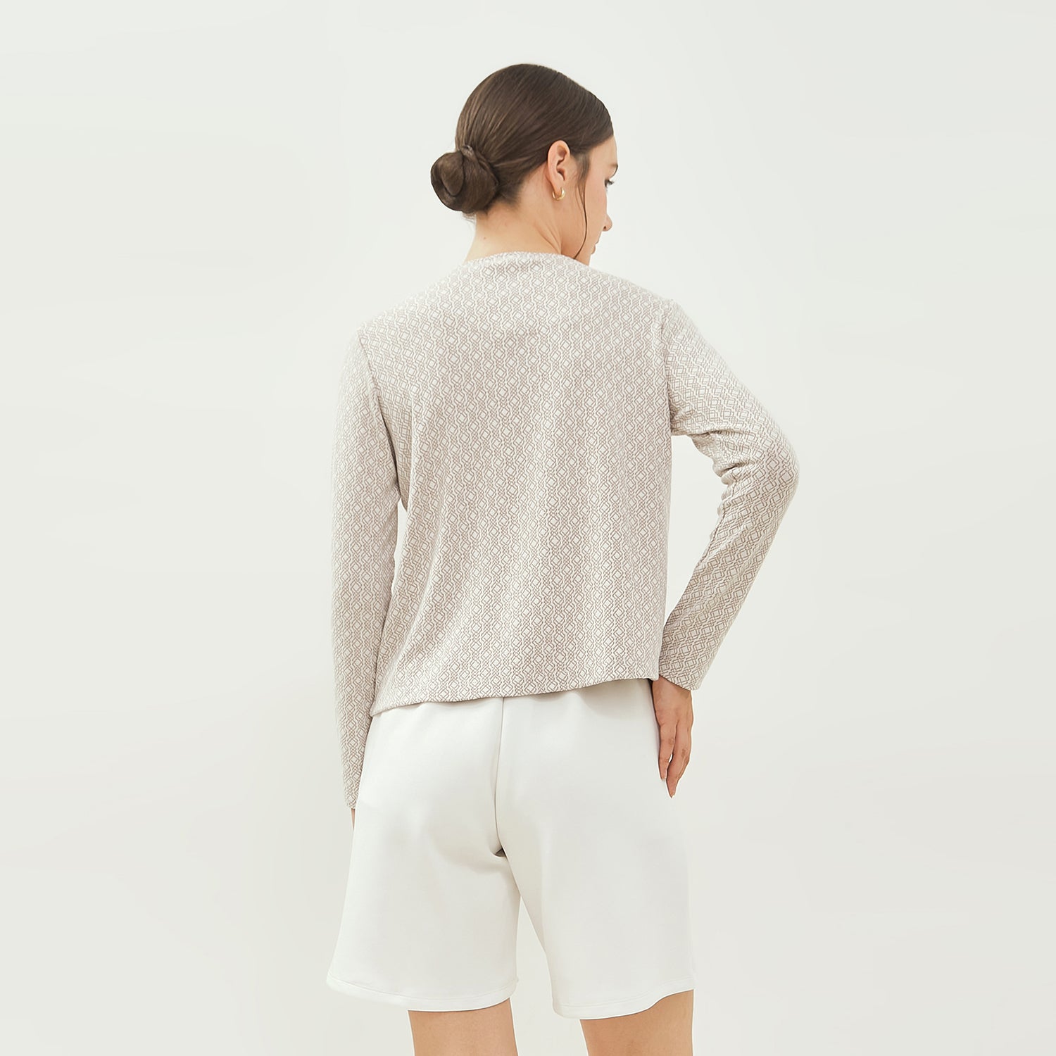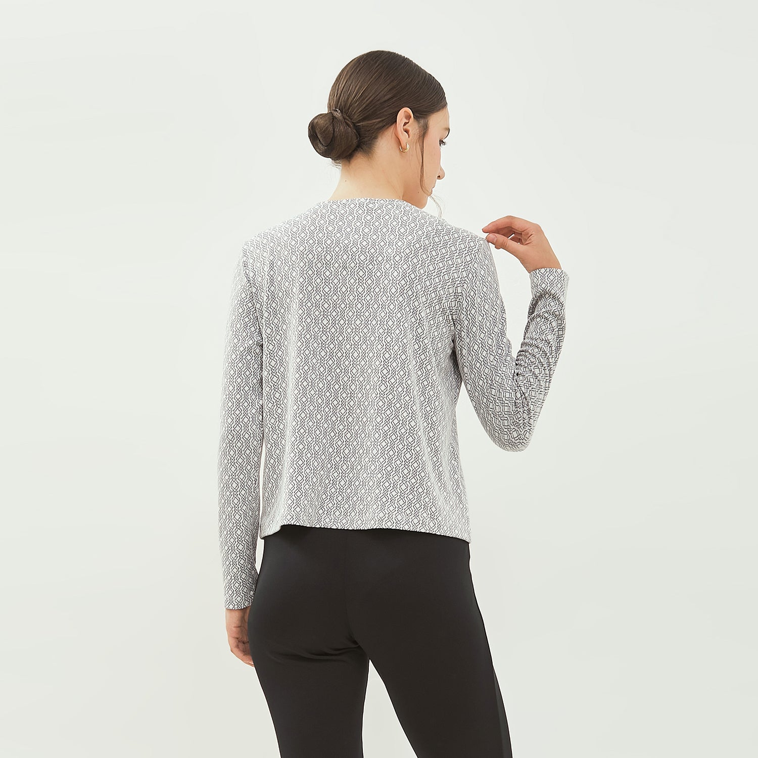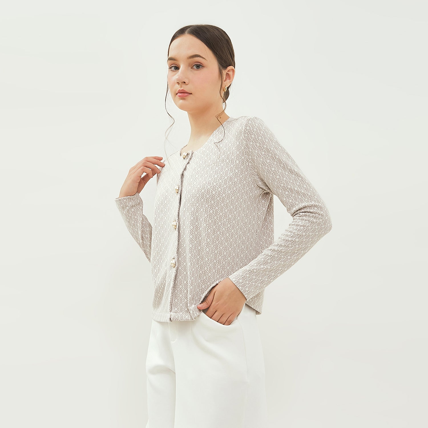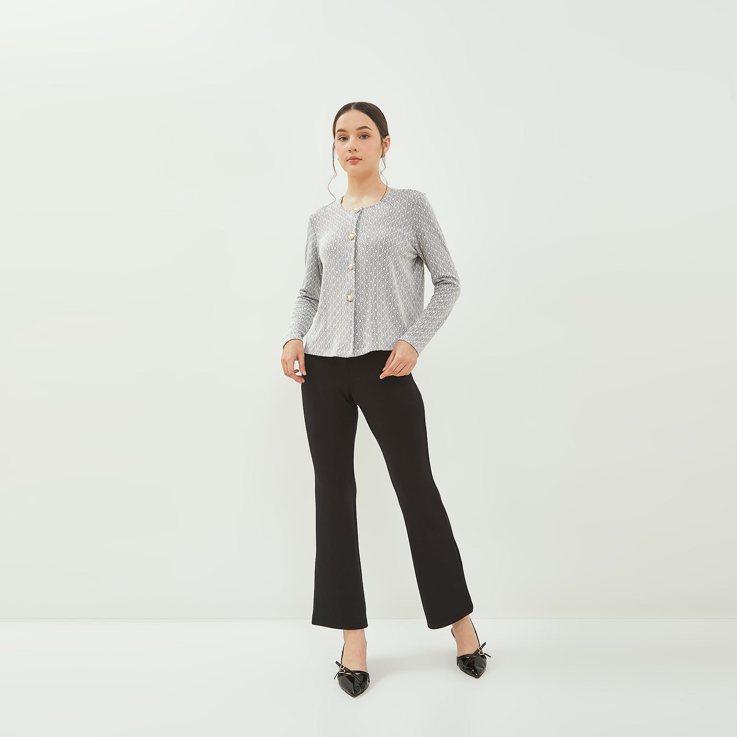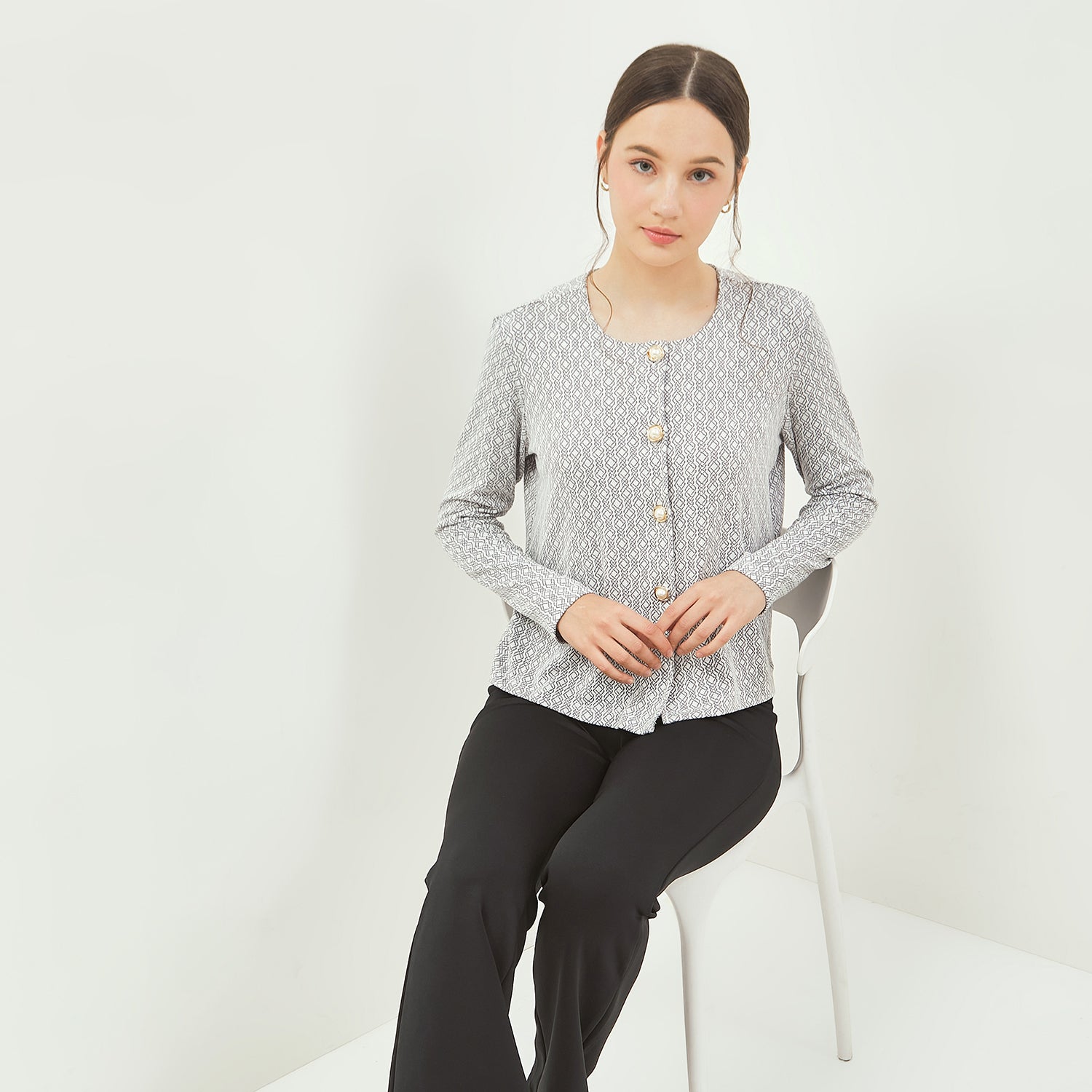 - Perpaduan material knit yang fleksibel dengan detail motif menjadikan blus ini pilihan sempurna untuk tampilan feminin yang elegan sekaligus modern