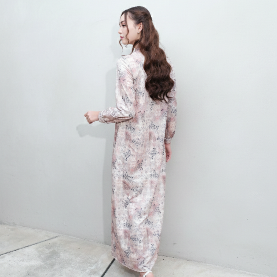 Dress ini memiliki lengan panjang dengan manset cuff serta bukaan kancing di ujung lengan, memberikan detail klasik yang refined