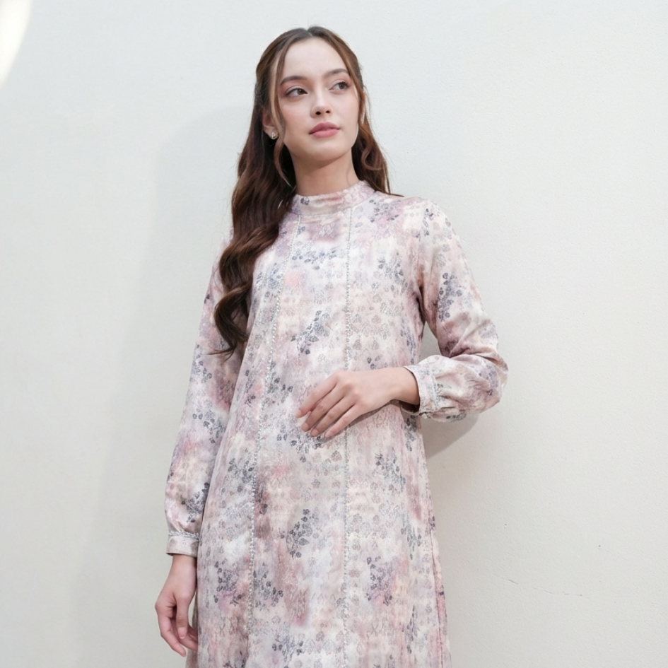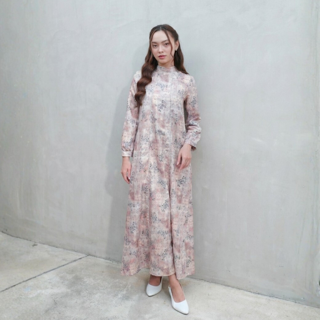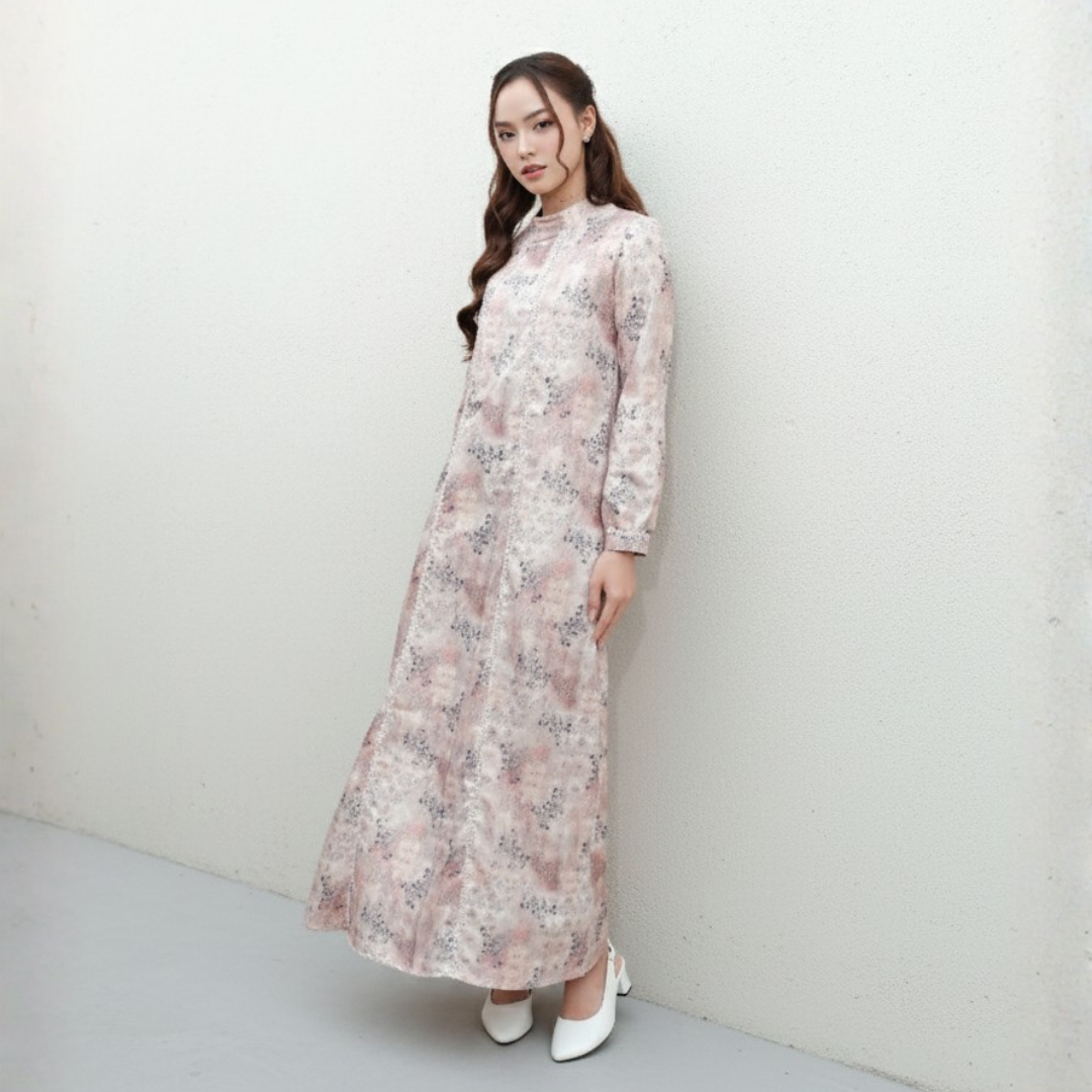 Maxi dress bergaya simplicity dengan motif bunga elegan yang menghadirkan kesan anggun dan feminin