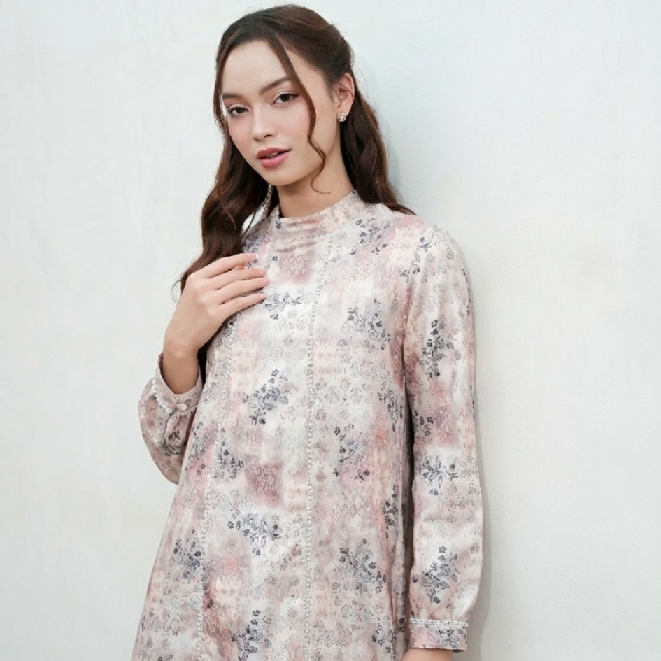 Aksen pearl yang membentang melintang di bagian depan blus menjadi focal point yang menambah sentuhan mewah