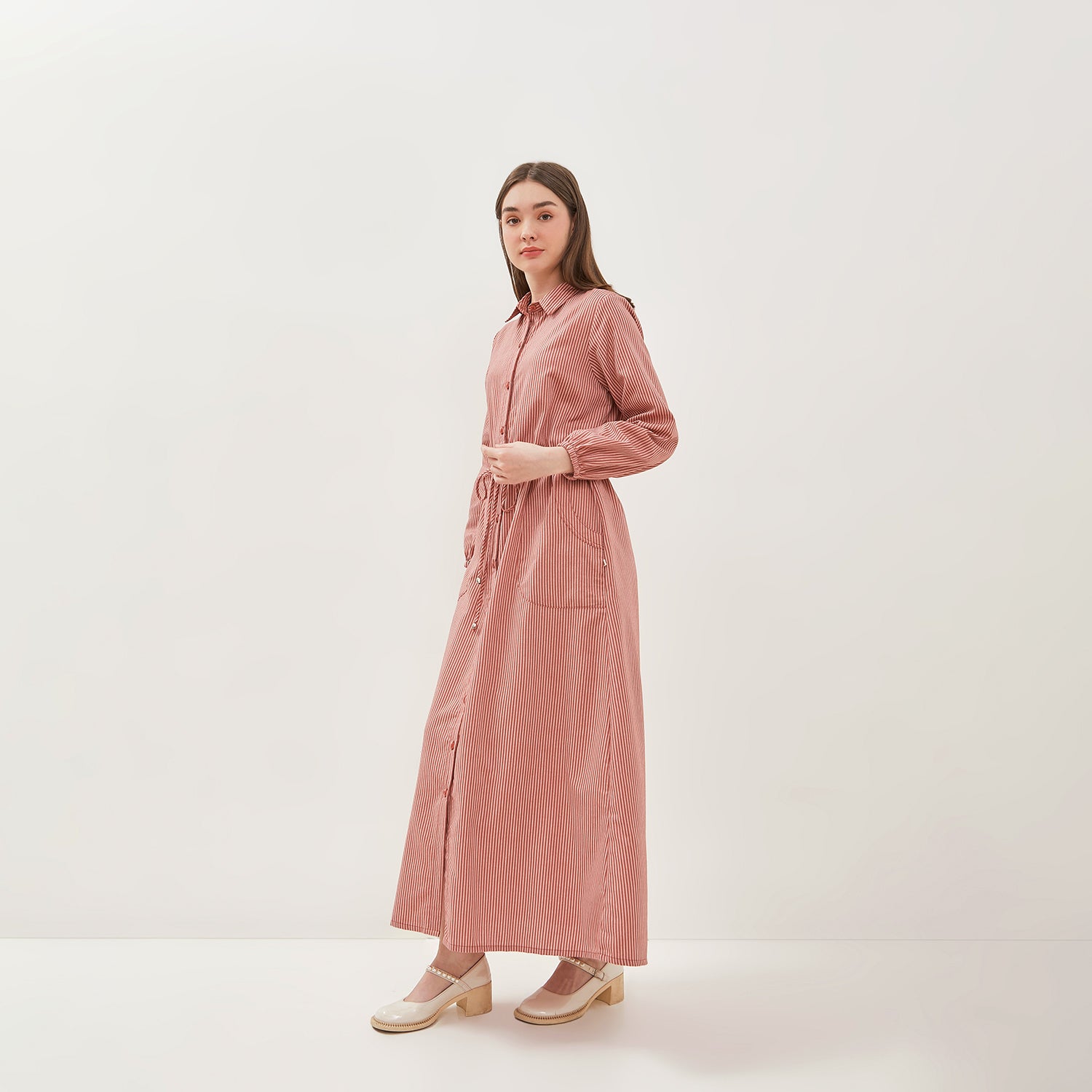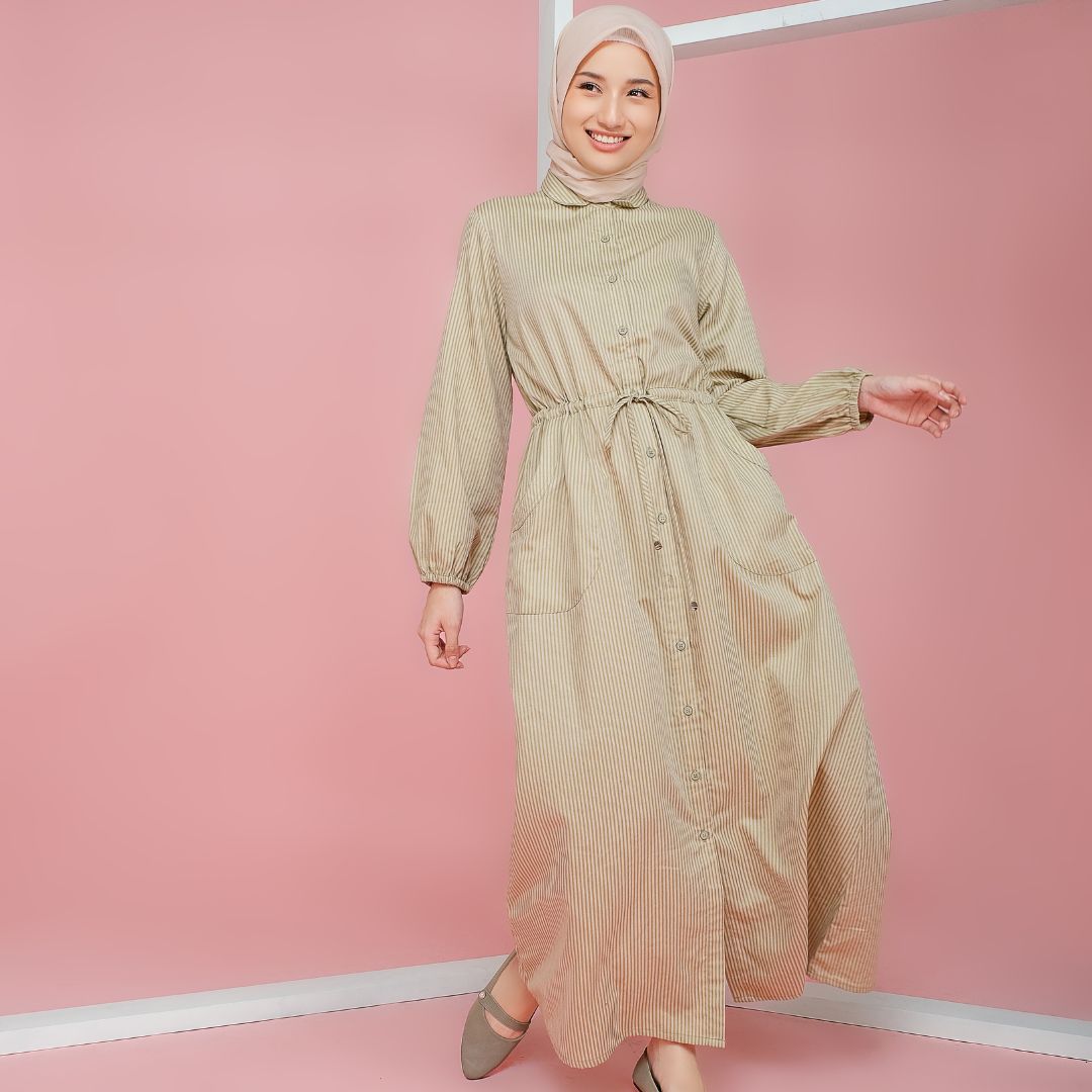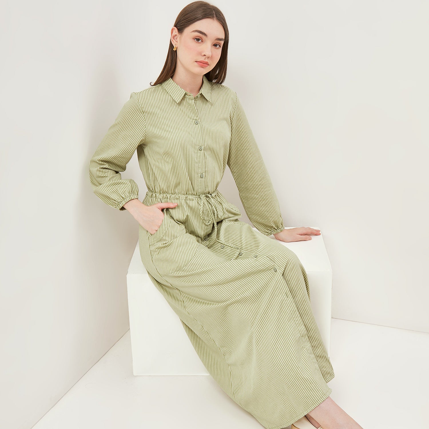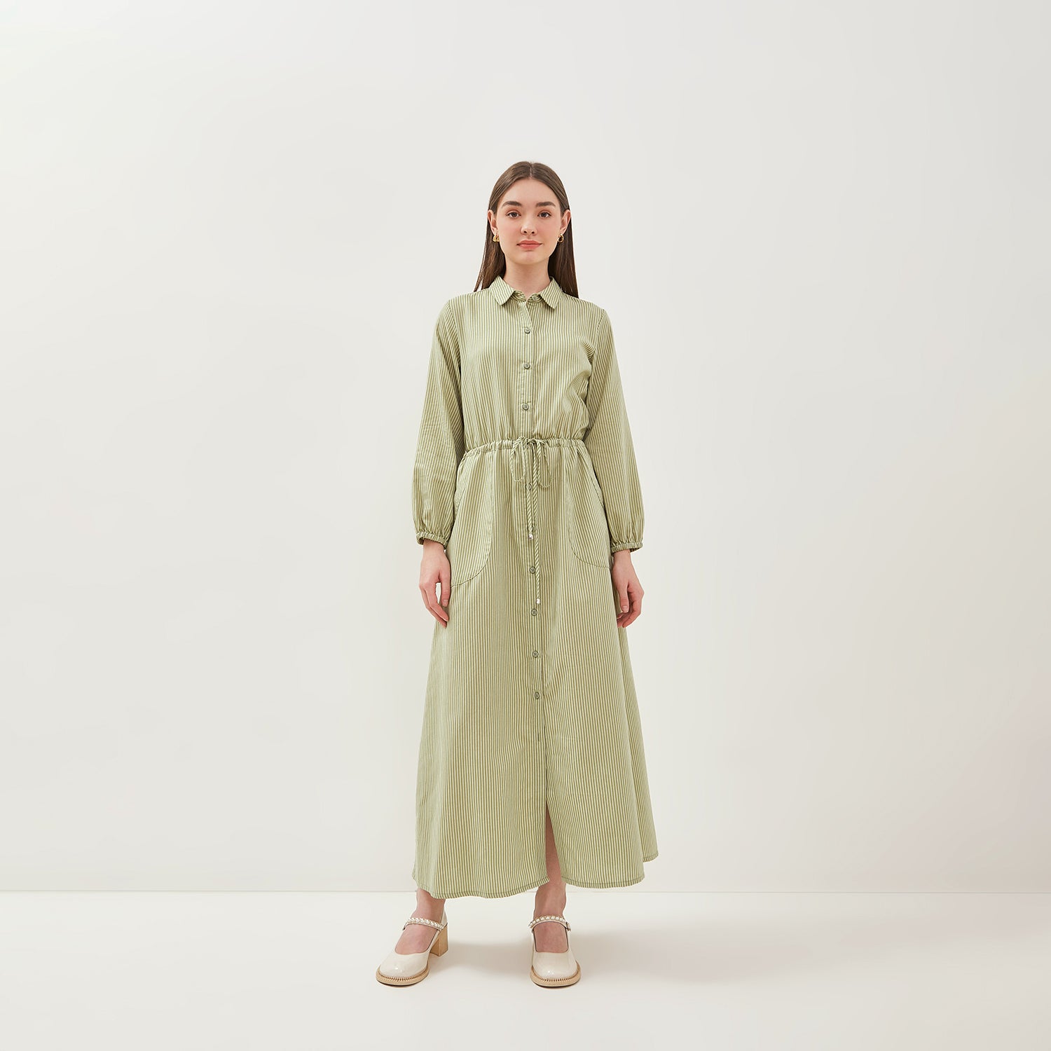 - Dengan bukaan kancing penuh di bagian depan, dress ini memadukan kemudahan dan keanggunan