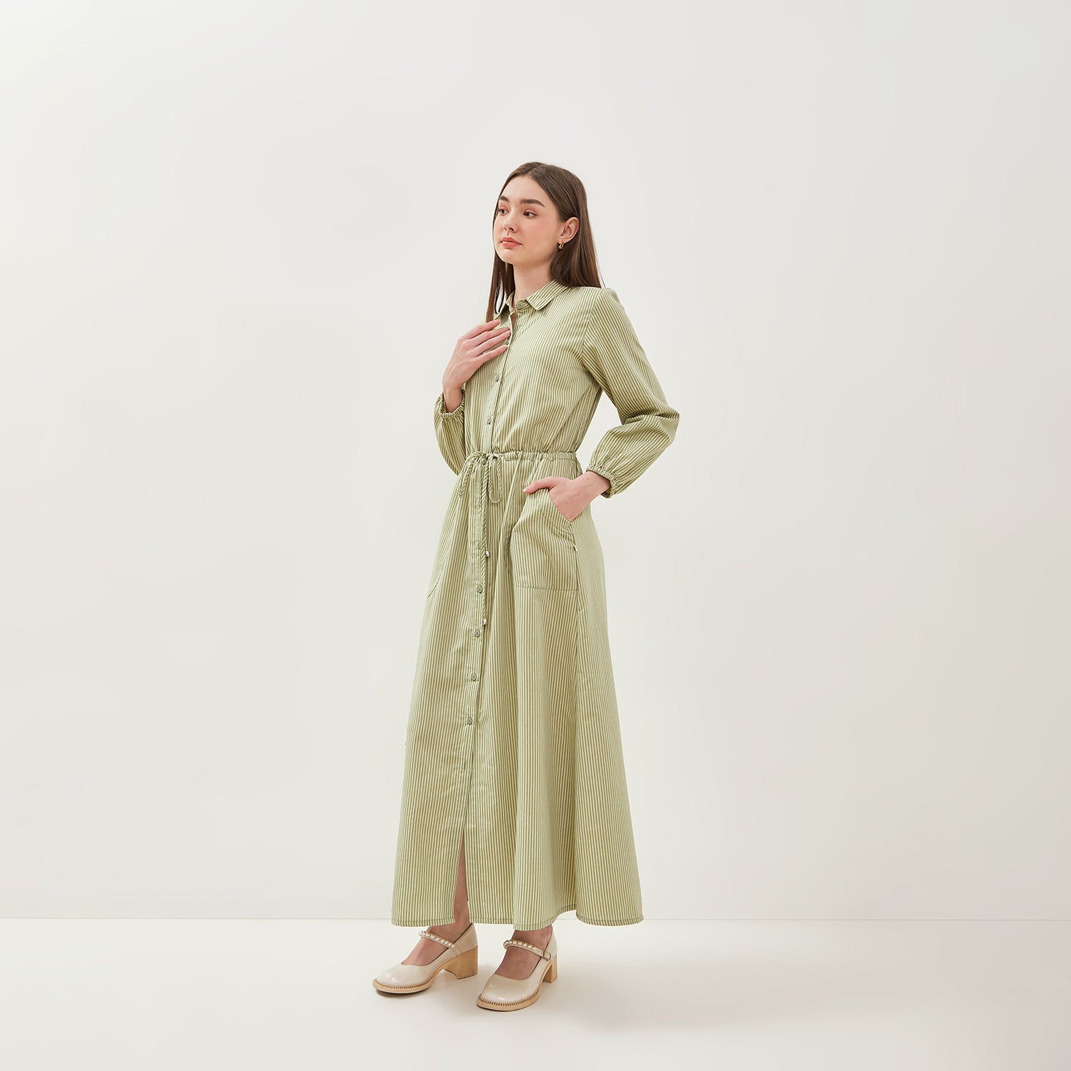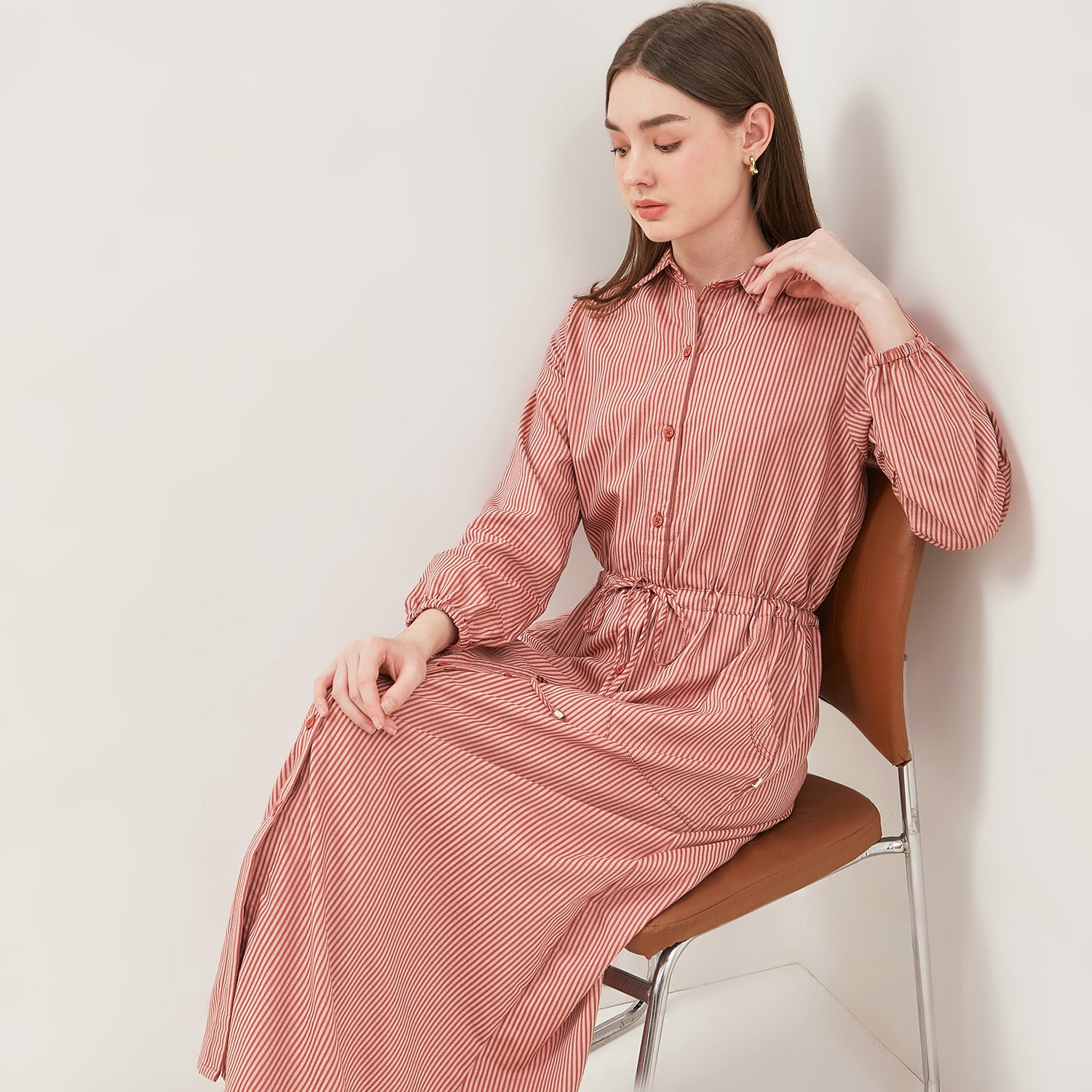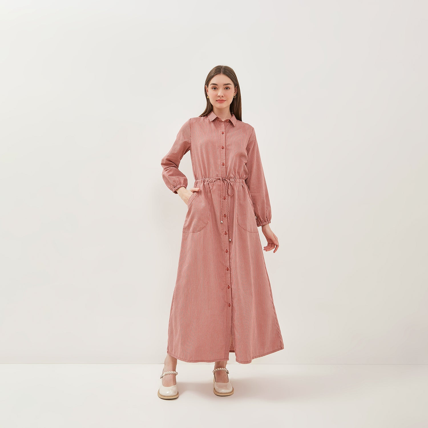 - Dengan bukaan kancing penuh di bagian depan, dress ini memadukan kemudahan dan keanggunan