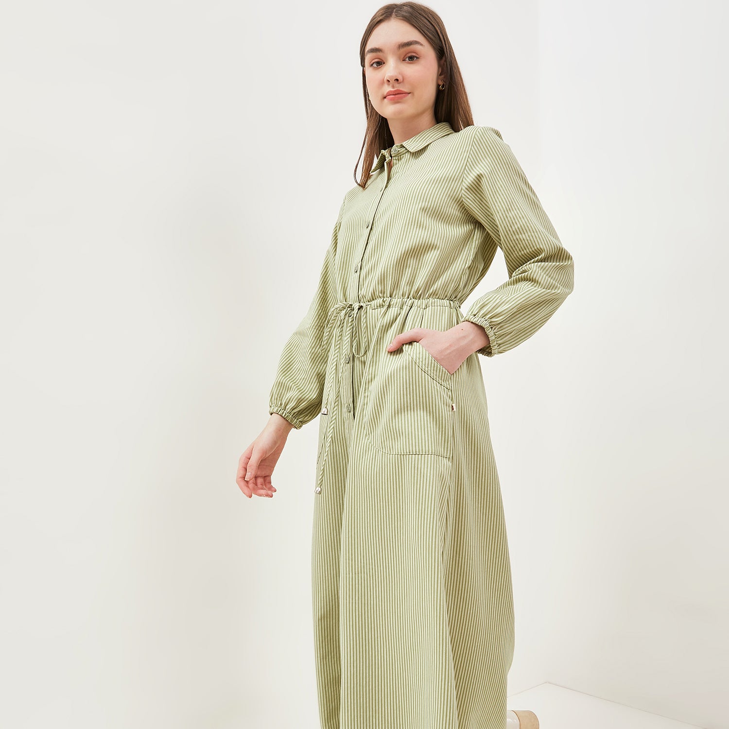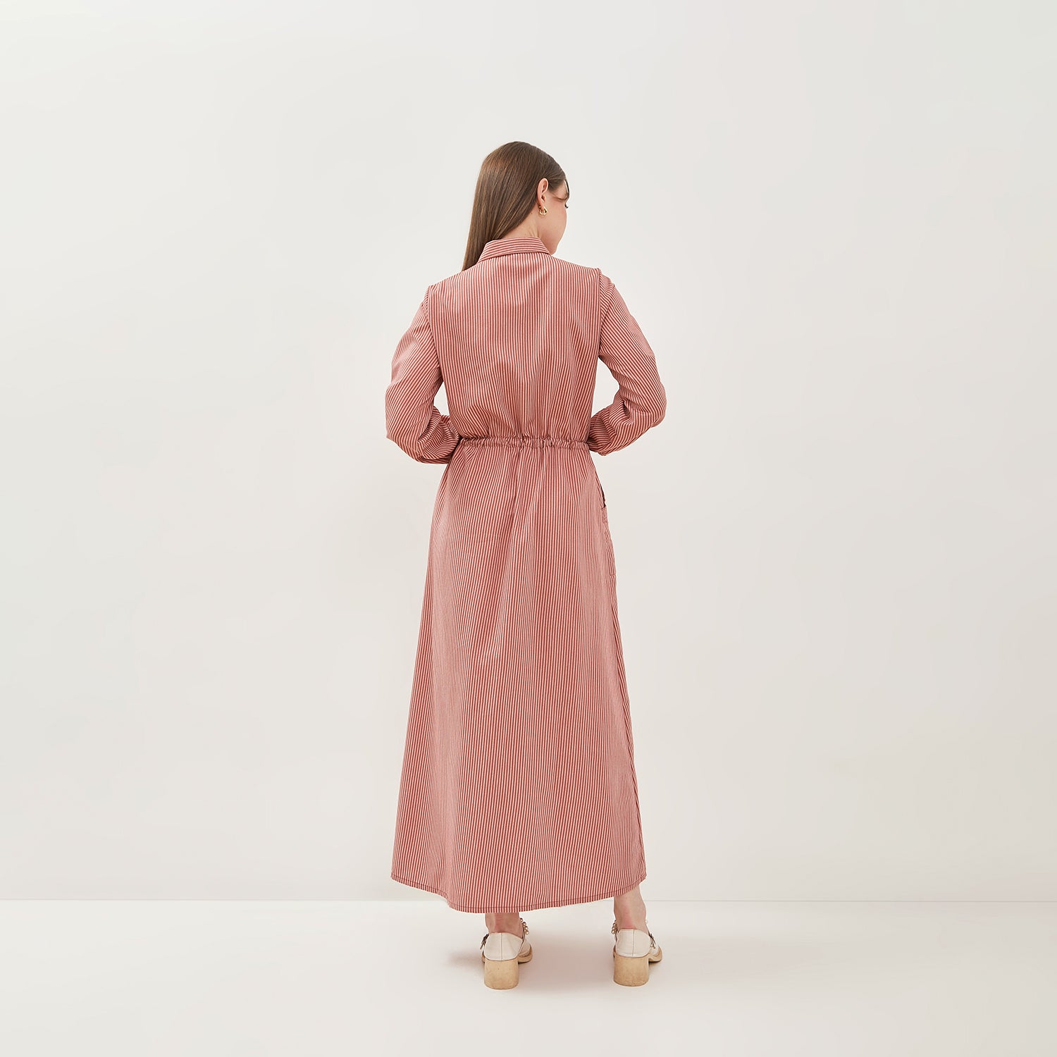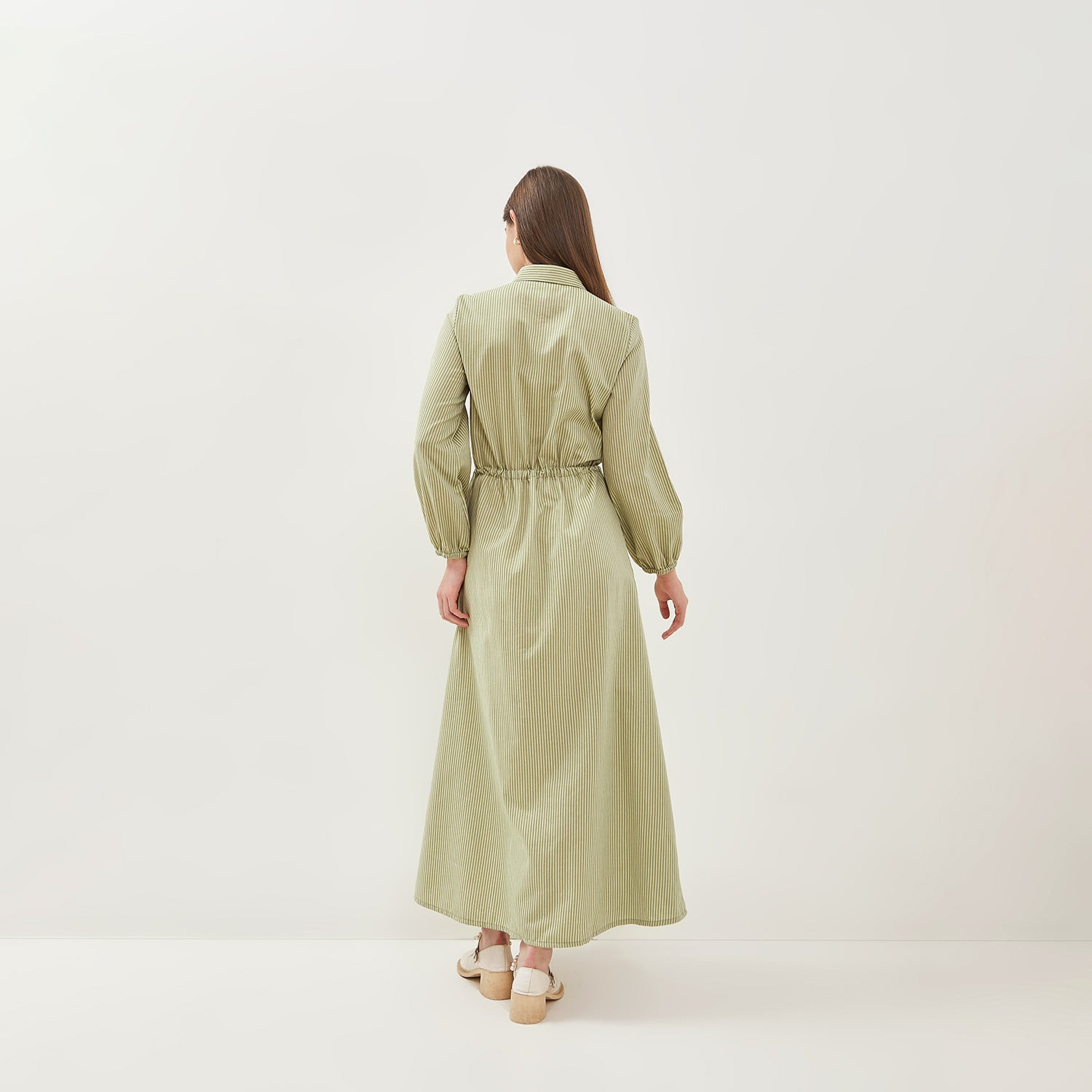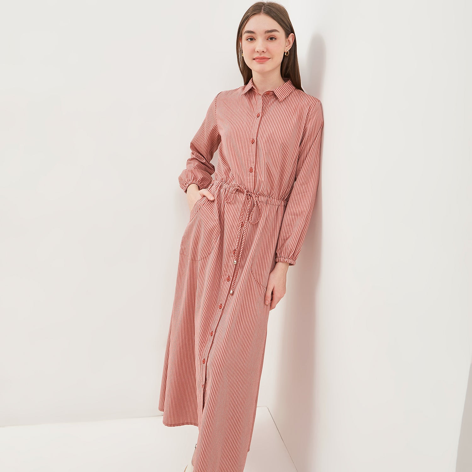 - Dengan bukaan kancing penuh di bagian depan, dress ini memadukan kemudahan dan keanggunan