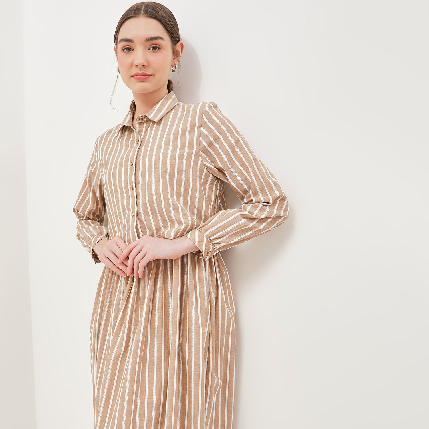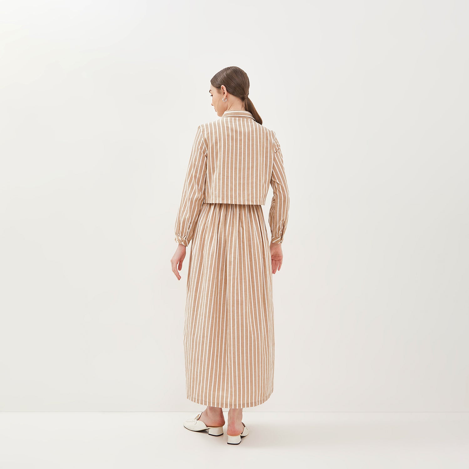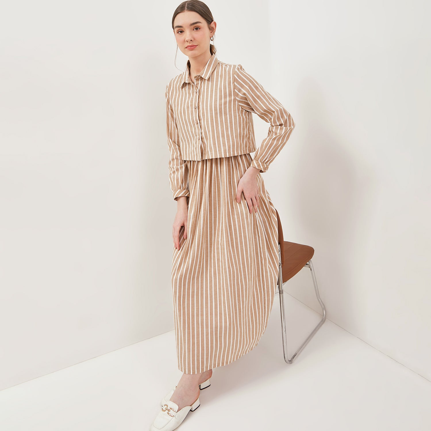 - Motif vertikal pada gaun ini memberikan efek elongasi tubuh, menambah kesan tinggi dan ramping