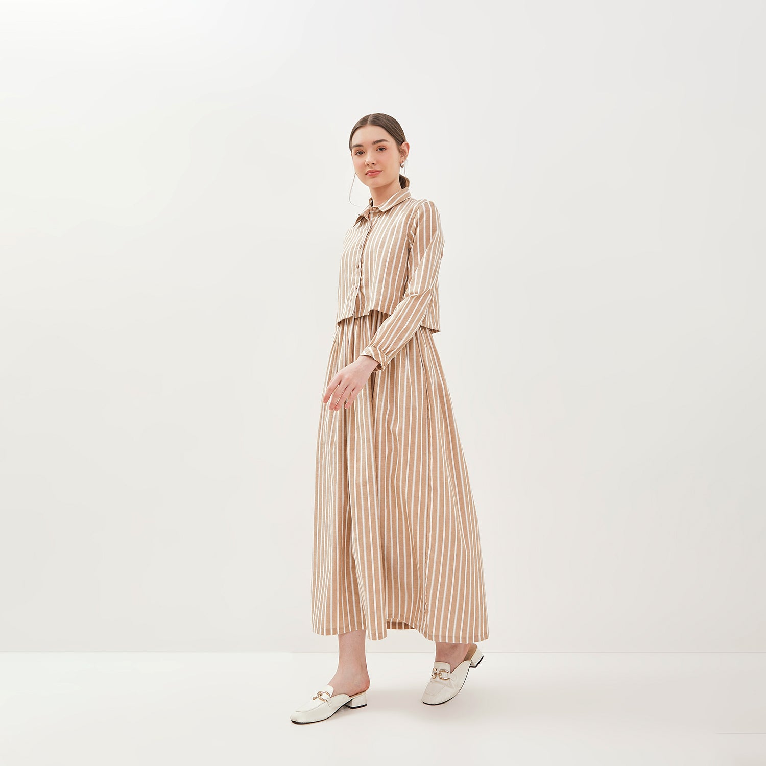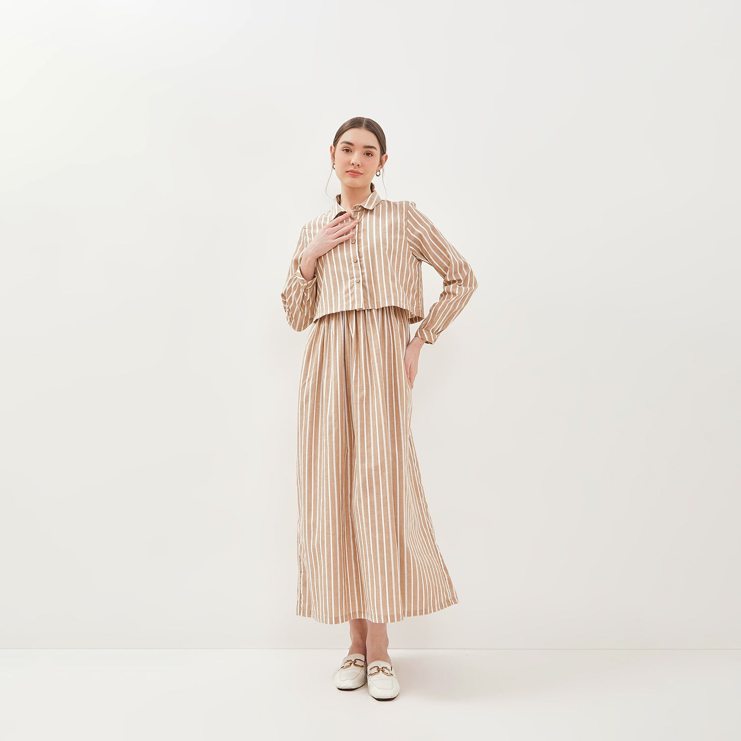 - Model kerah kemeja pada bagian atas menambah kesan formal dan elegan, sementara lengan panjang dengan bukaan kancing di ujung lengan memberikan kesan klasik yang modis
