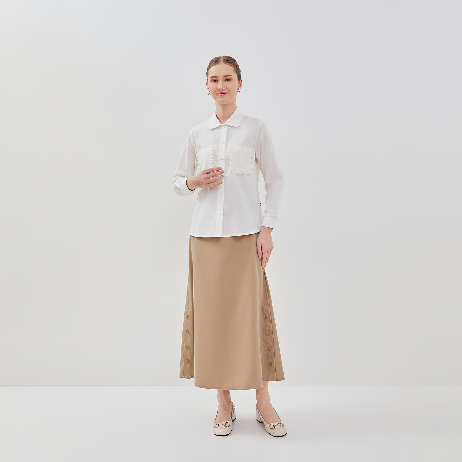 **Model juga menggunakan "GRAPHIS Snap Button A-Line Maxi Skirt" sebagai bawahan
