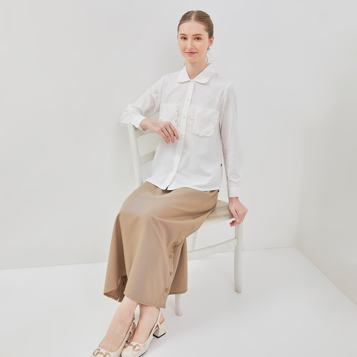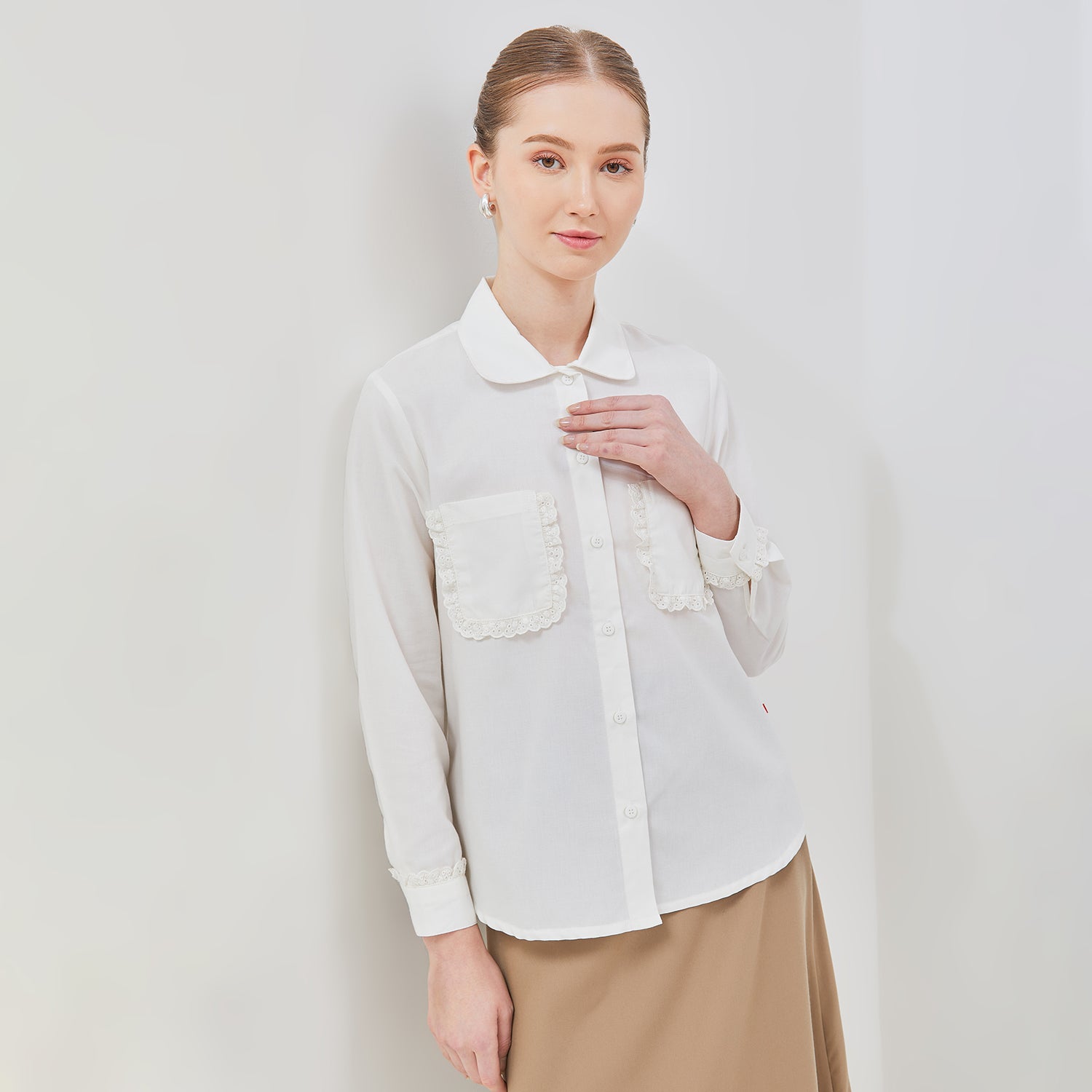 Lengan panjang dengan cuff dan bukaan kancing di ujungnya, serta aksen lace yang memberi nuansa playful dan feminin