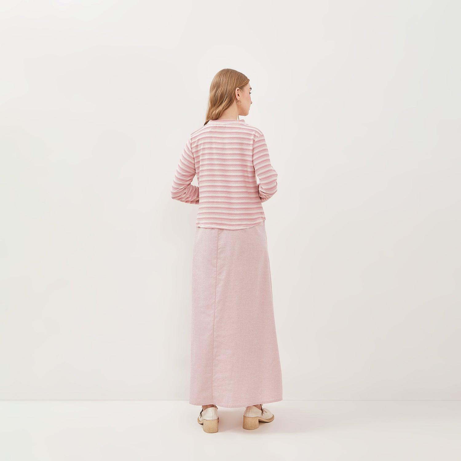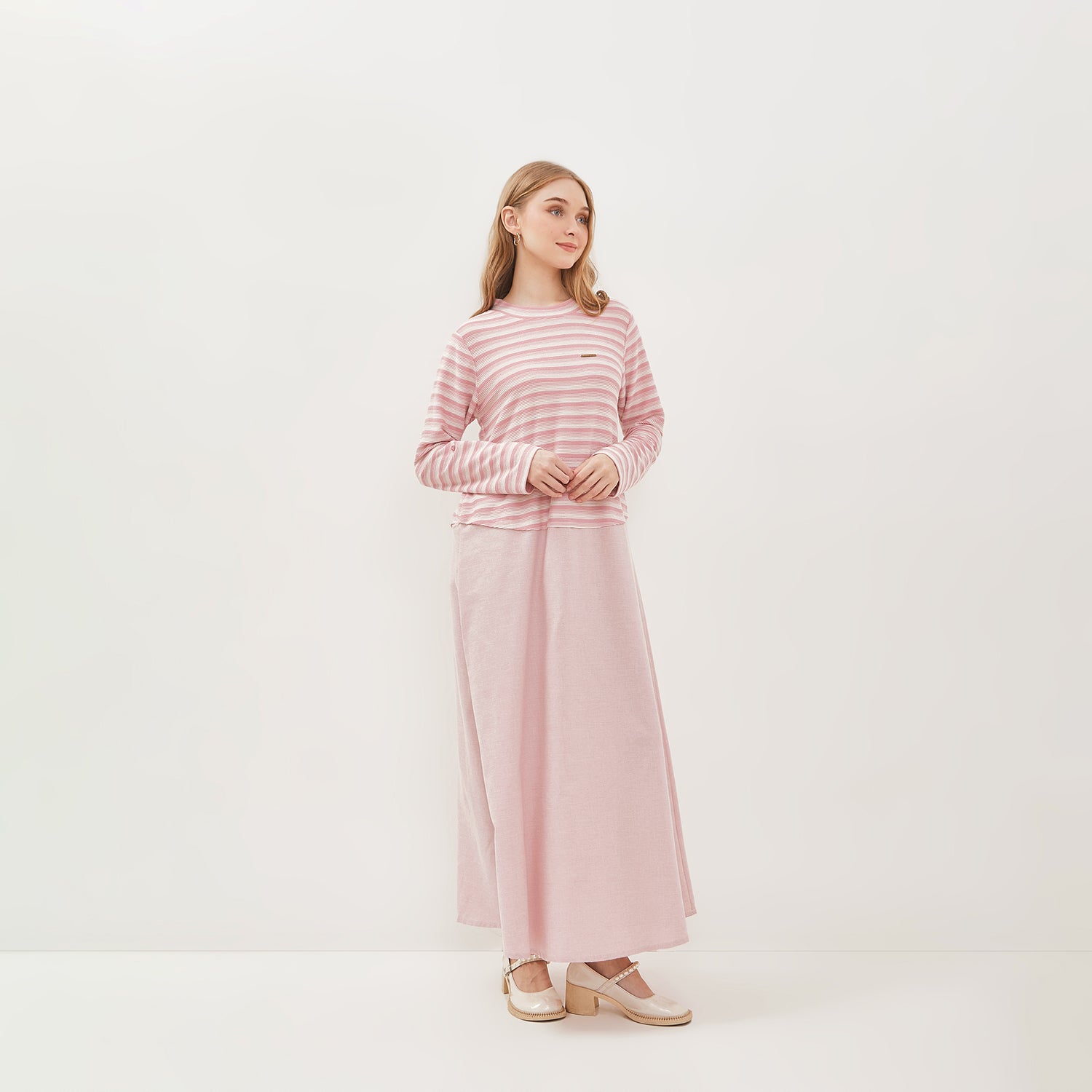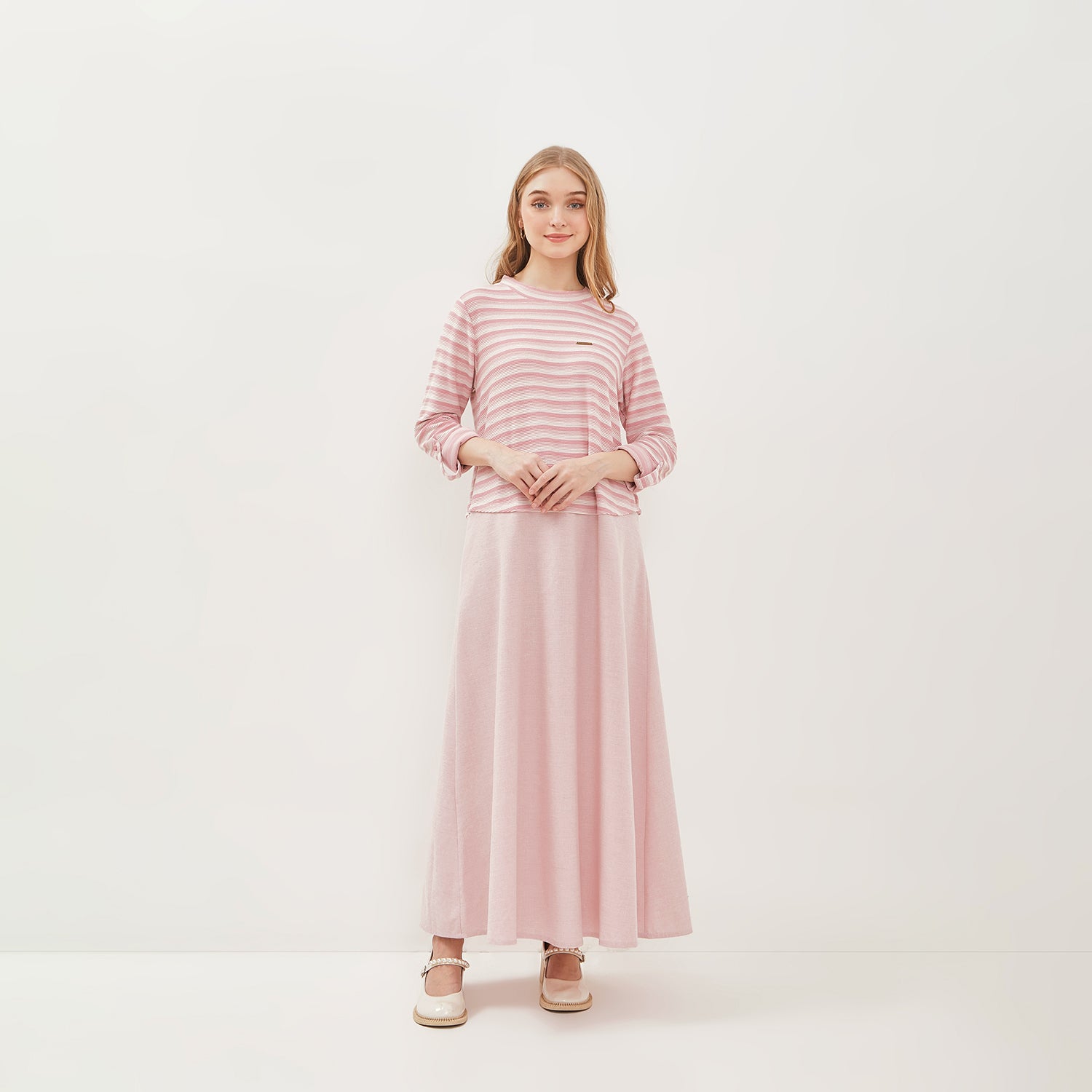 - Bagian atas dress terbuat dari bahan knit dengan motif garis yang memberikan kesan dinamis dan nyaman dipakai. Sedangkan bagian bawah gaun menggunakan bahan katun yang ringan dan adem, memberikan kenyamanan ekstra sepanjang hari