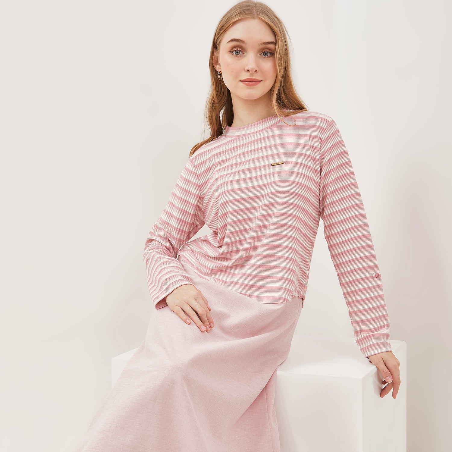 - Lengan panjang yang dilengkapi dengan kancing, sehingga memungkinkan lengan untuk digulung atau di-roll up, memberi fleksibilitas dalam penampilan