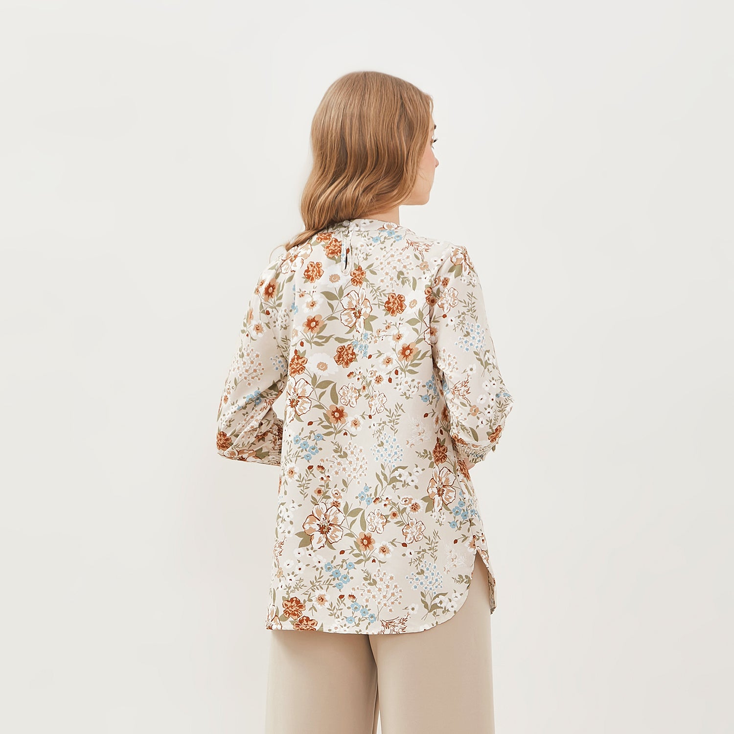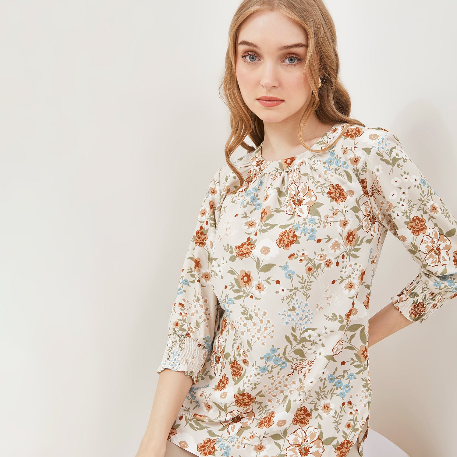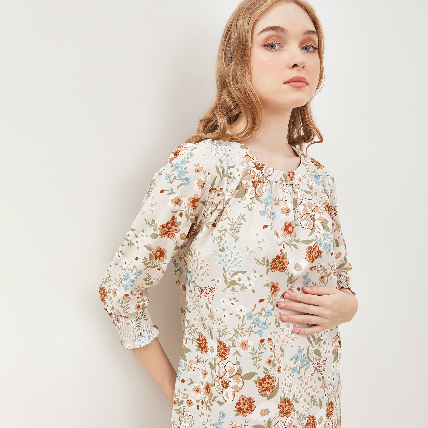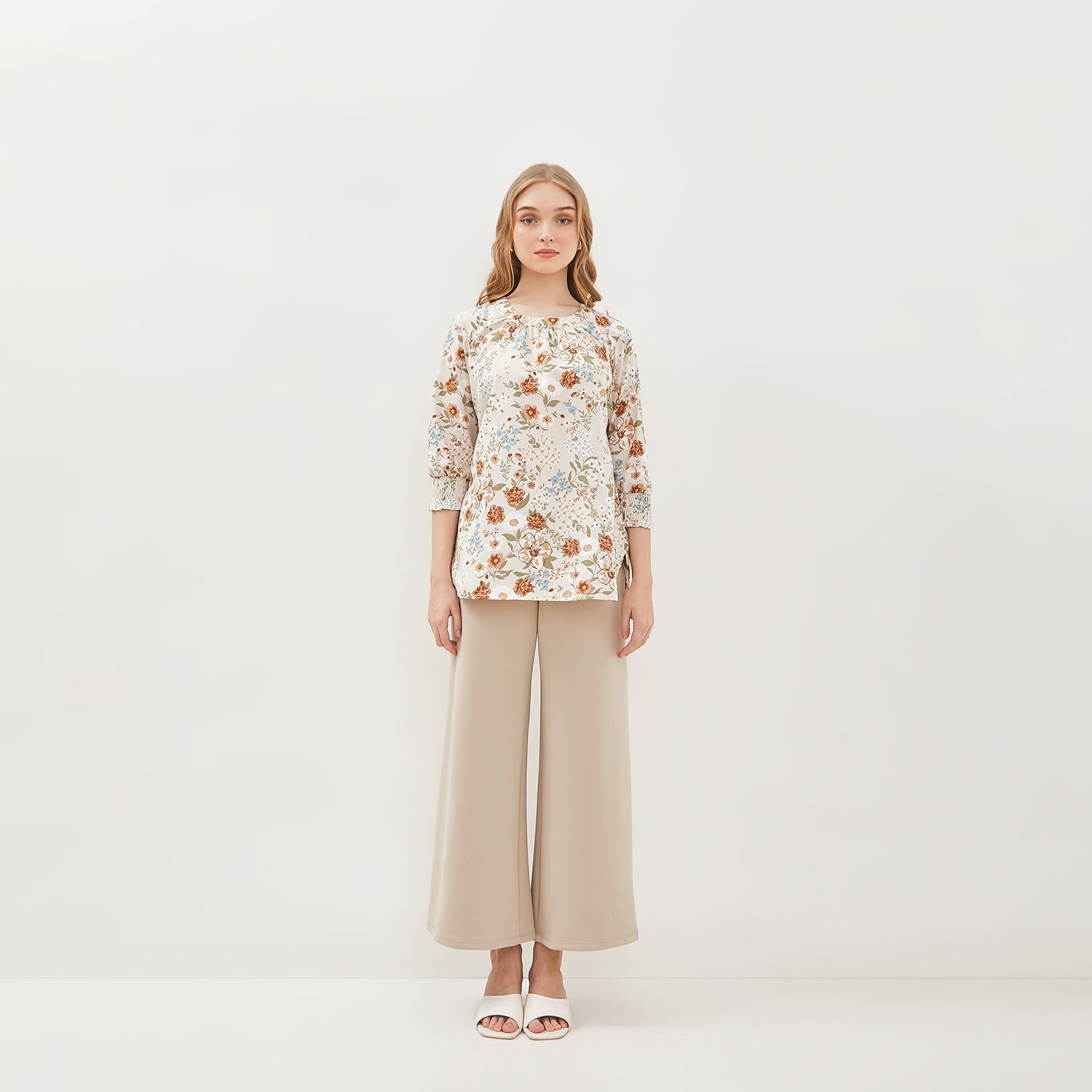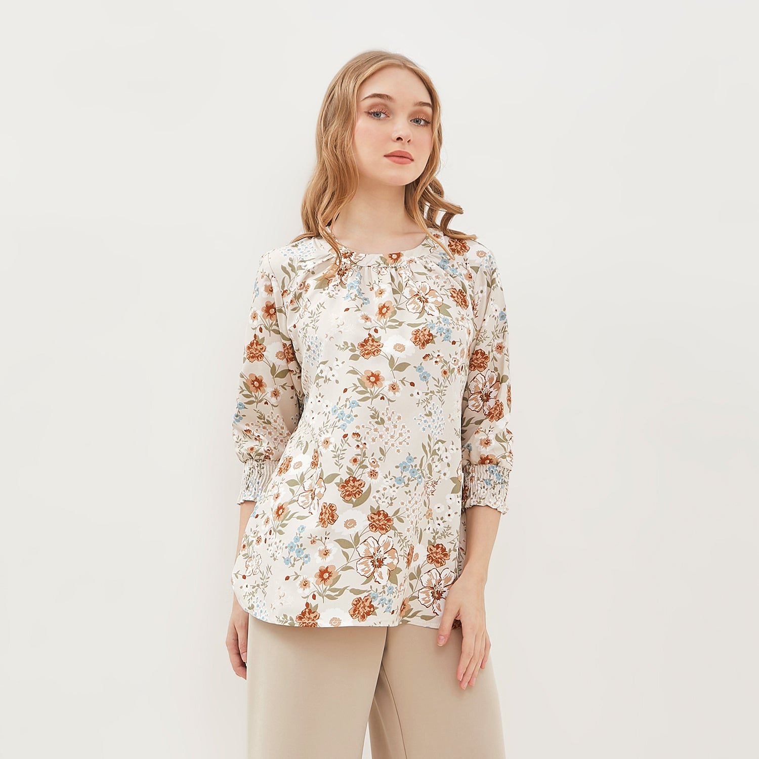 - Panjang lengan 3/4 dilengkapi dengan detail karet elastik model smock di ujungnya, yang memberikan efek ruche yang cantik dan mempertegas siluet lengan