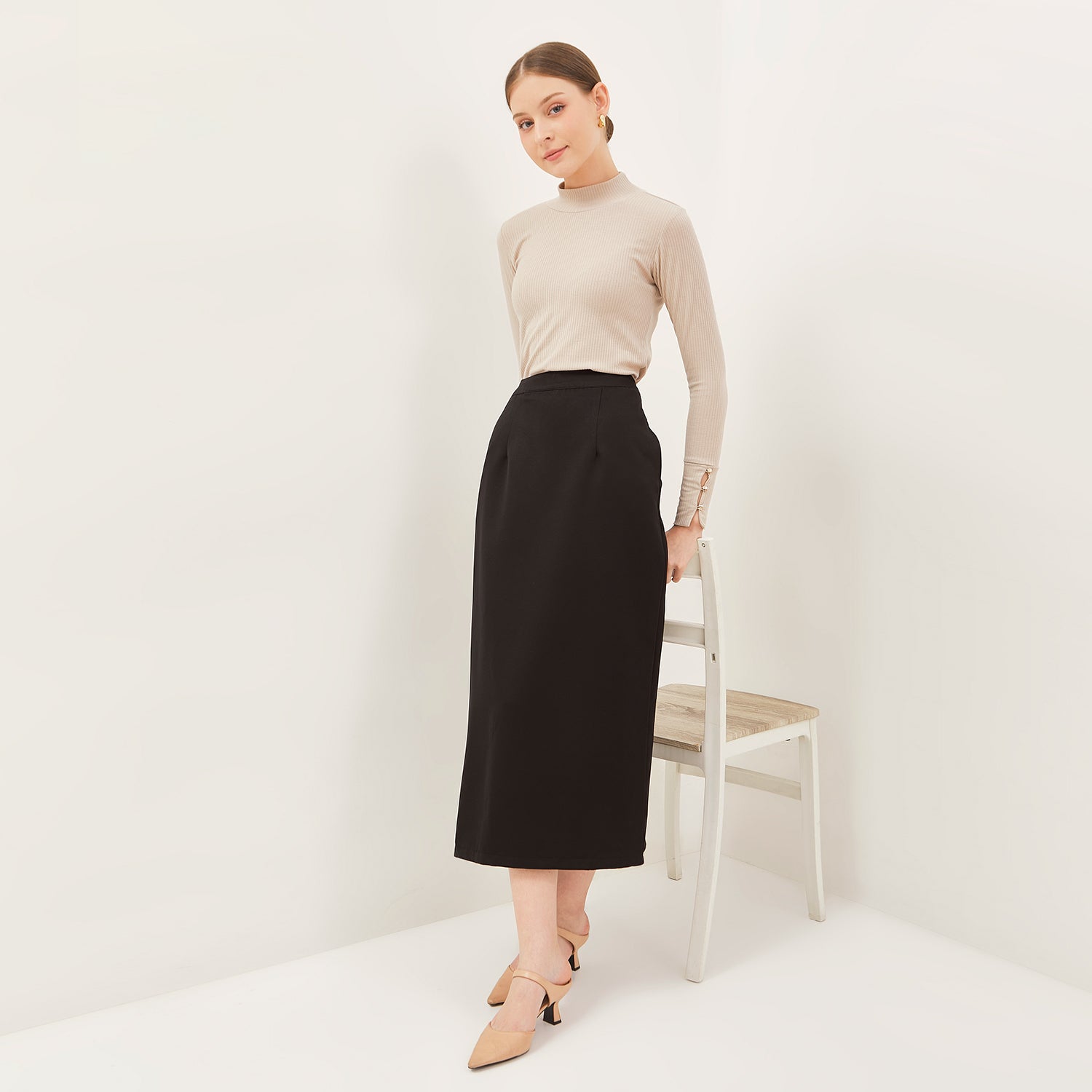 Bagian pinggang didesain tanpa karet untuk tampilan lebih rapi, dilengkapi bukaan sleting di bagian belakang untuk memudahkan pemakaian
