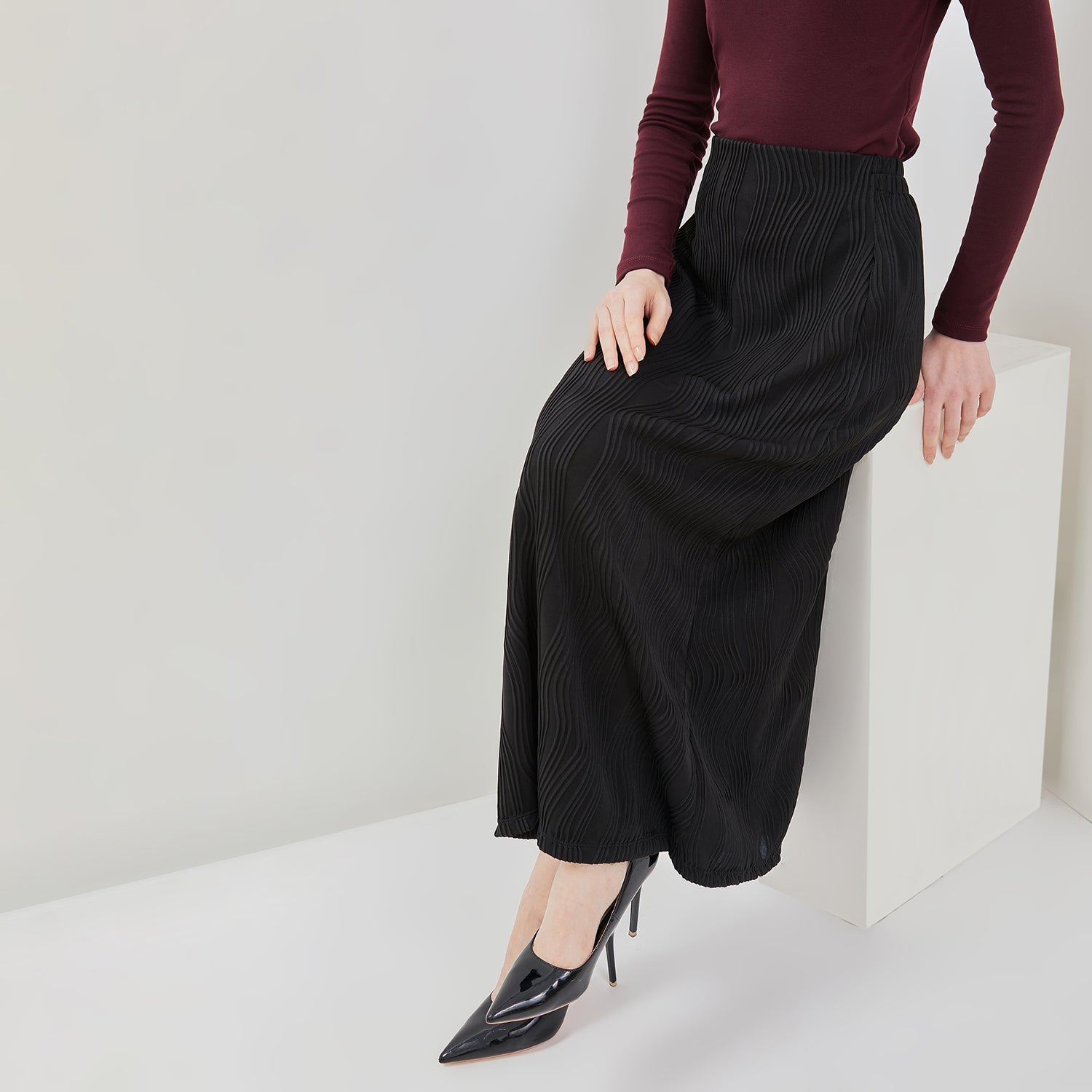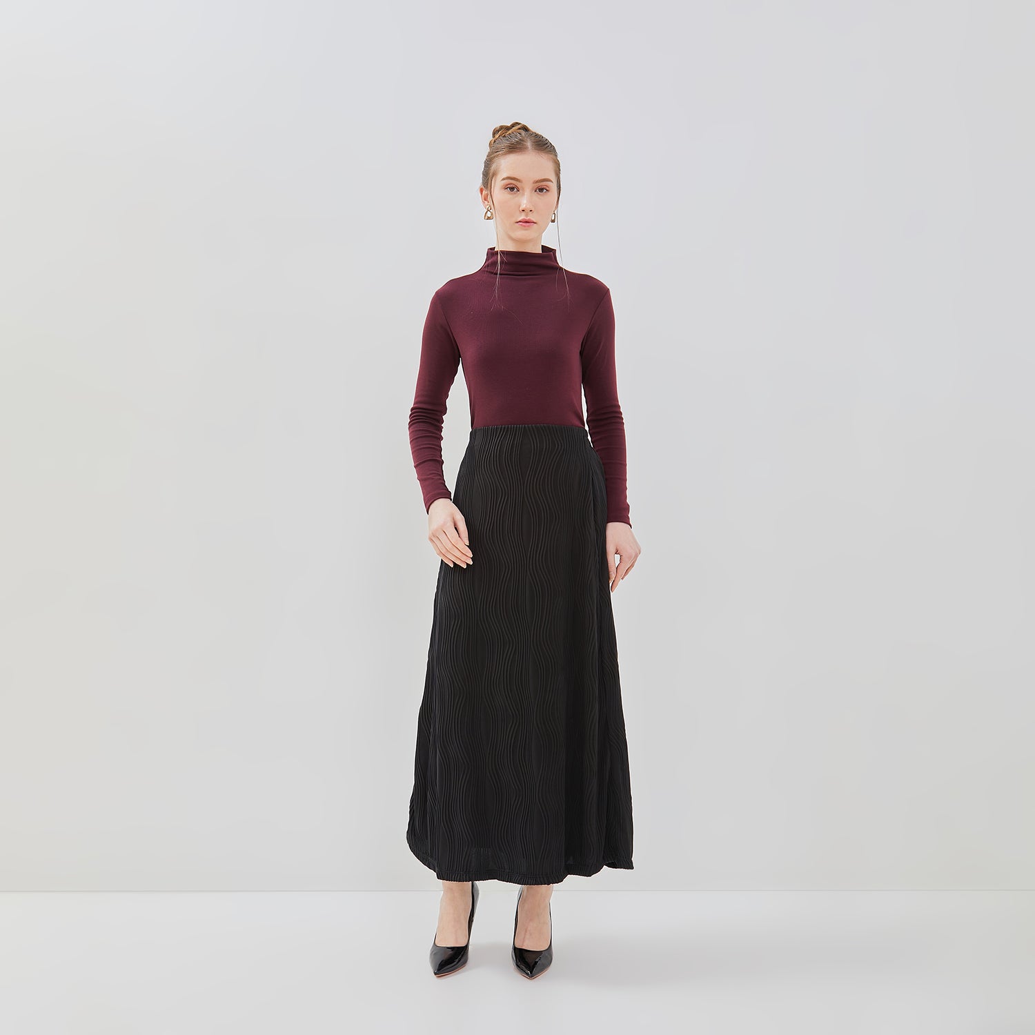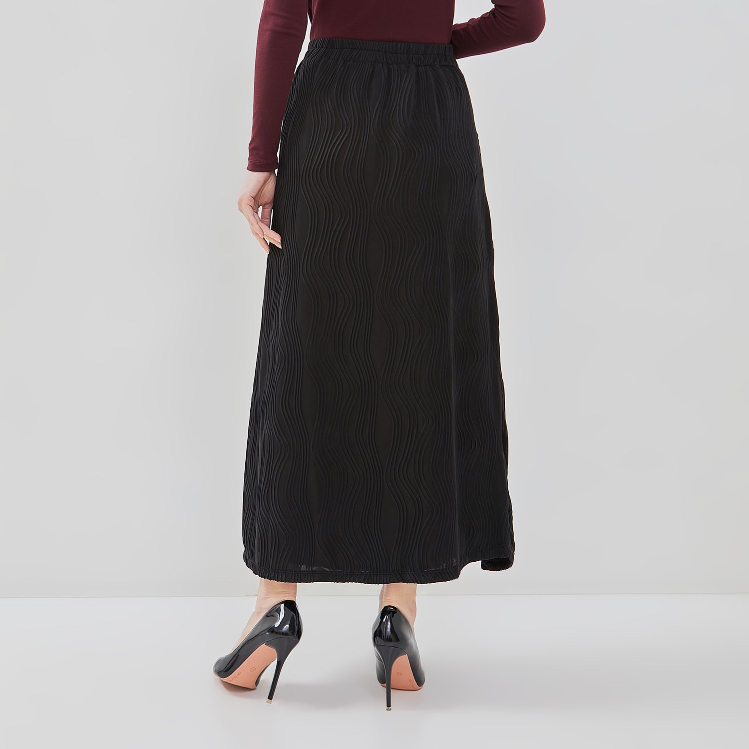 Rok maksi berbahan kain bertekstur gelombang vertikal yang memberikan kesan jatuh dan rapi